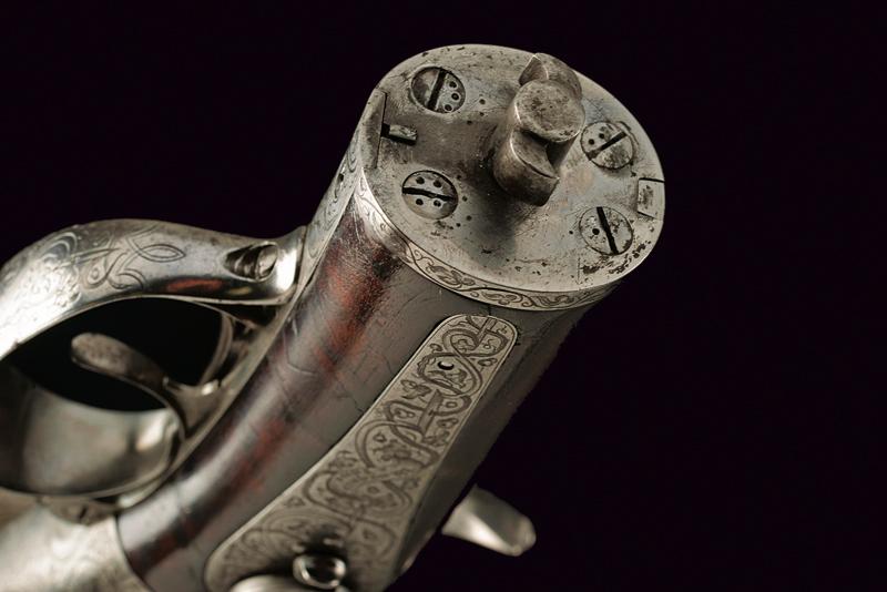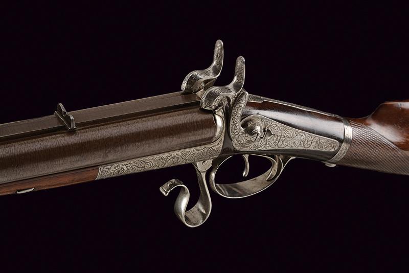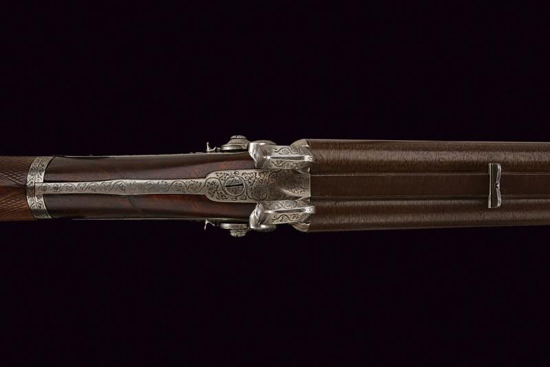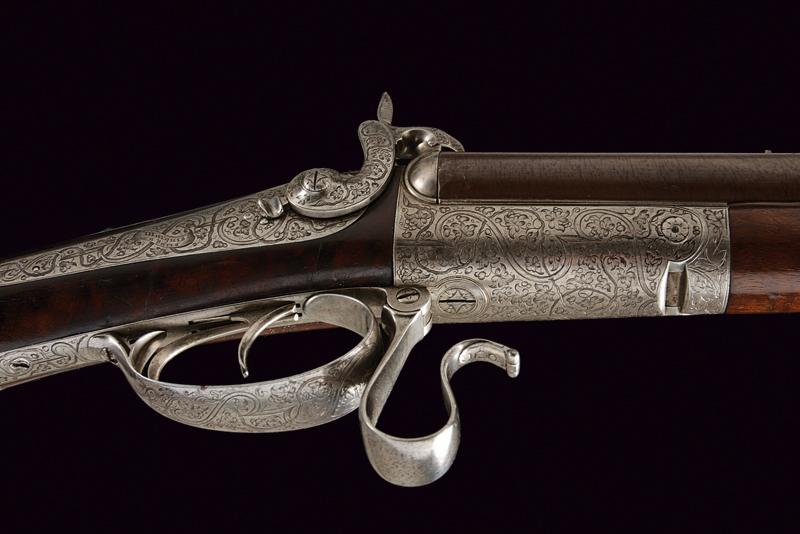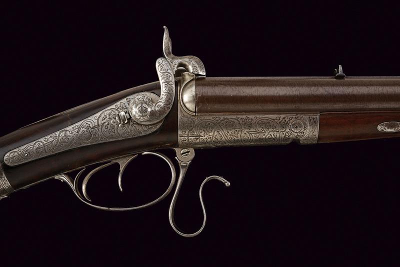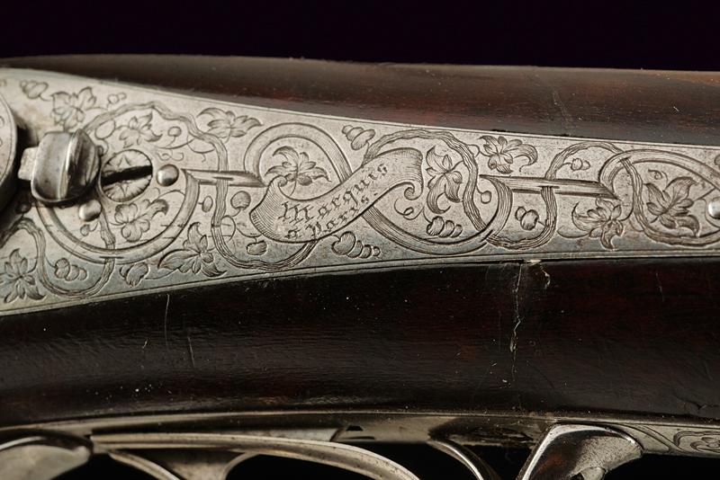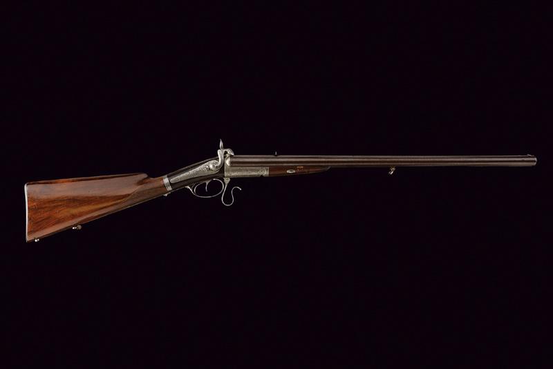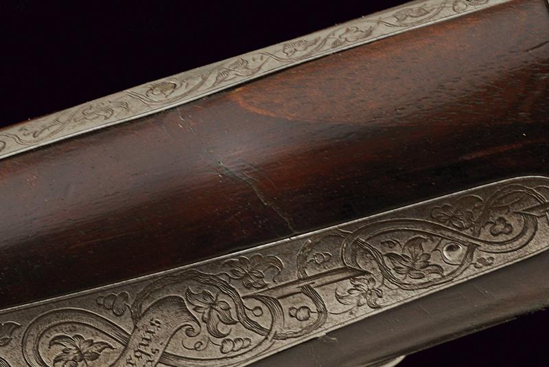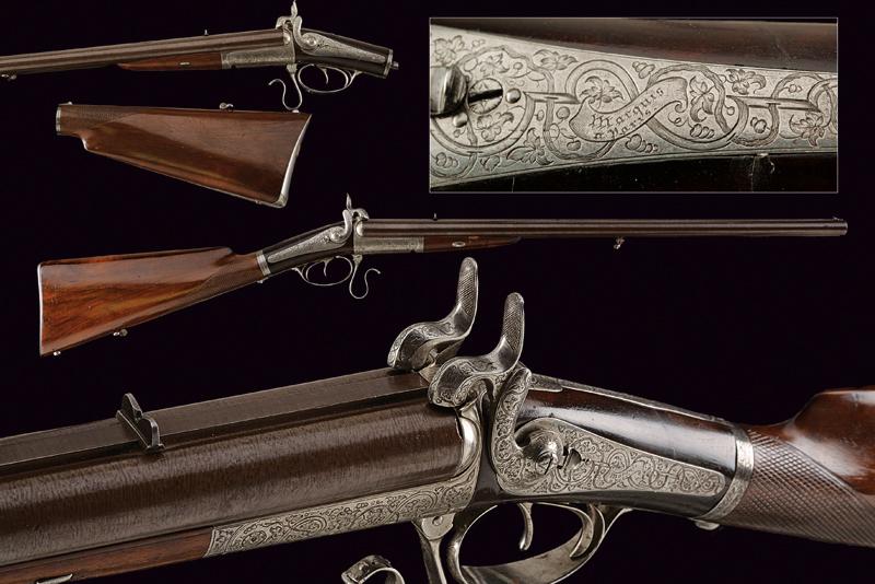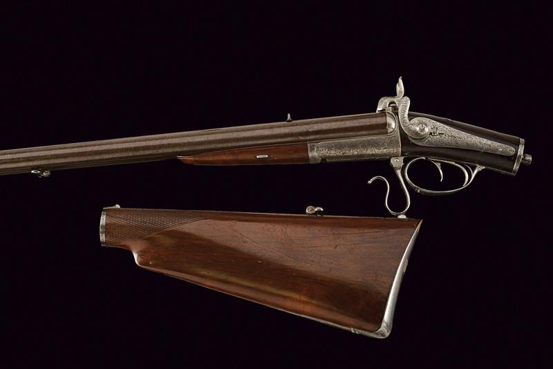 Interessante doppietta combinata smontabile di Marquis a Parigi, datazione: Terzo quarto del XIX Secolo provenienza: Francia, Canne tonde, una liscia cal. 16, una rigata cal. 15 mm. Brunite (brunitura rinfrescata). La bindella centrale dotata di mirino e alzo fisso. Interno con un po' di pitting, la rigatura ben visibile. Bascula incisa con una trama di tralci di vite intrecciati con bande decorative lisce, munita di leva d'apertura controcurvata, posta davanti al ponticello. Dentro alla bascula marcatura 'F. MARQUIS'. Le batterie a molla indietro con sicure esterne ai cani; le cartelle incise en suite con la bascula e recanti la firma 'Marquis a Paris' entro un cartiglio. Incisi anche i cani. Astina liscia in legno. Il collo in legno (con crepe). La pala del calcio smontabile. I fornimenti in ferro, sempre con incisioni a tralci di vite. Per Marquis Francis di Parigi (circa1835-1872), vedi 'Der Neue Stoeckel', vol 2 pag. 761. lunghezza 101 cm.