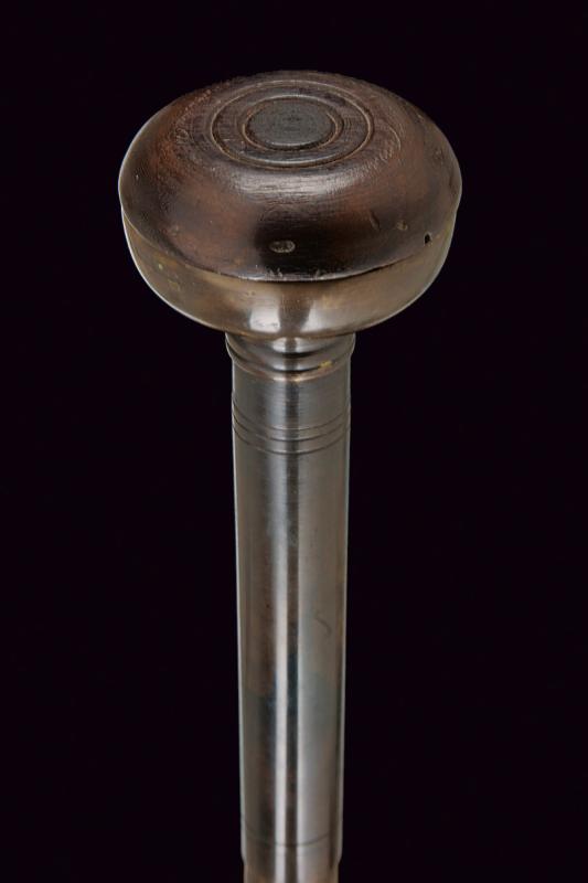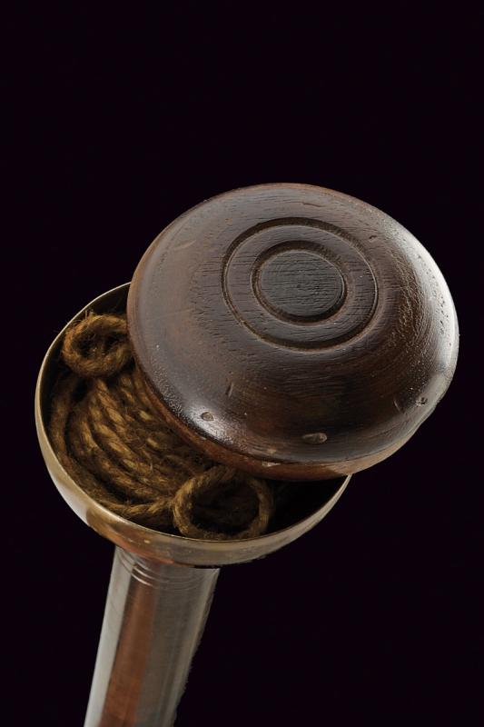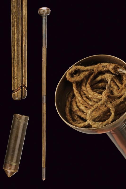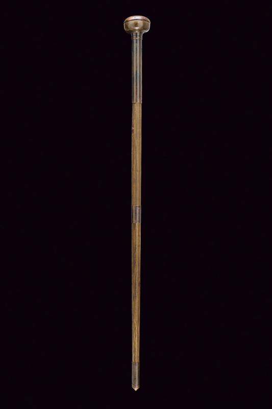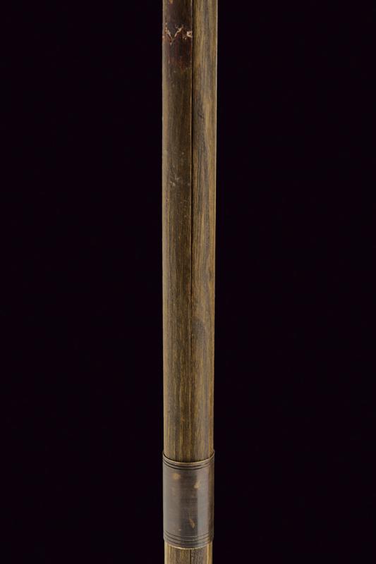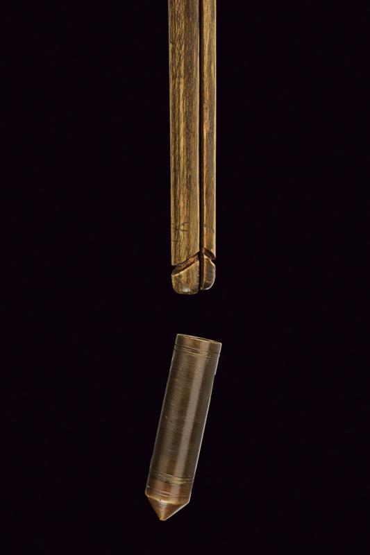 Raro bastone animato con arco, datazione: XIX Secolo provenienza: Europa, Testa in ottone e legno. All'interno uno scomparto per conservare la corda. Il fusto può essere separato in due metà (una con riparazione) che rimontate insieme costituiscono un arco. altezza total closed 95,5 cm.