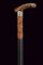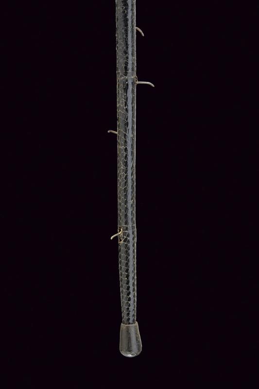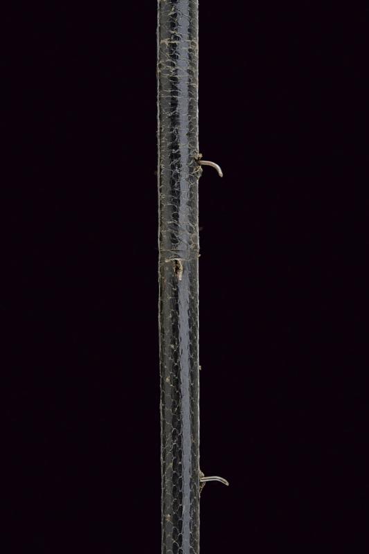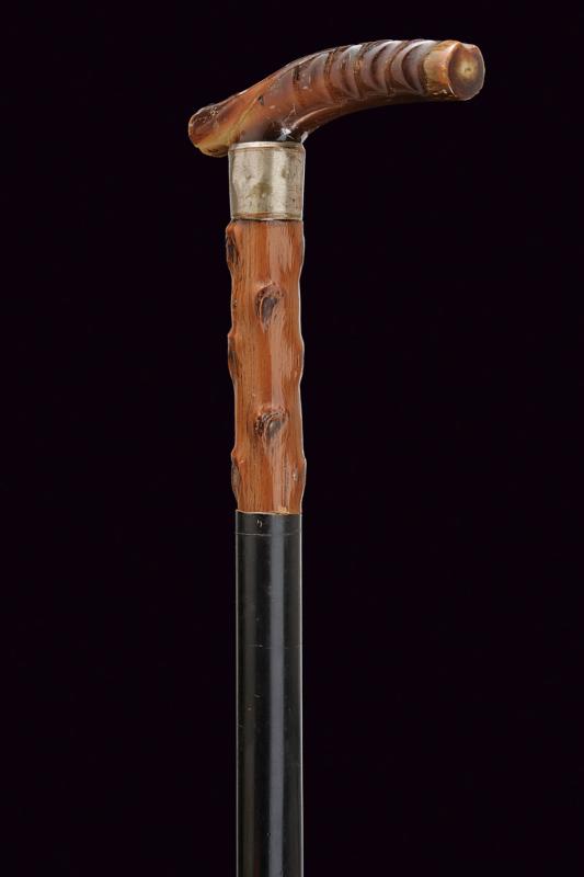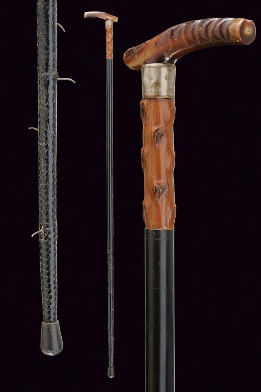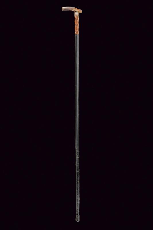 Bastone da difesa sul tipo 'redoutable', datazione: Fine del XIX Secolo provenienza: Europa, Impugnatura in corno. Ghiera metallica. Il primo segmento del fusto in legno ornato a nodi, poi una lunga sezione cilindrica in metallo, l'ultima parte con rivestimento in pelle (piccoli danni) munita di piccole cuspidi che escono tirando l'impugnatura. Piede in gomma. lunghezza 95 cm.