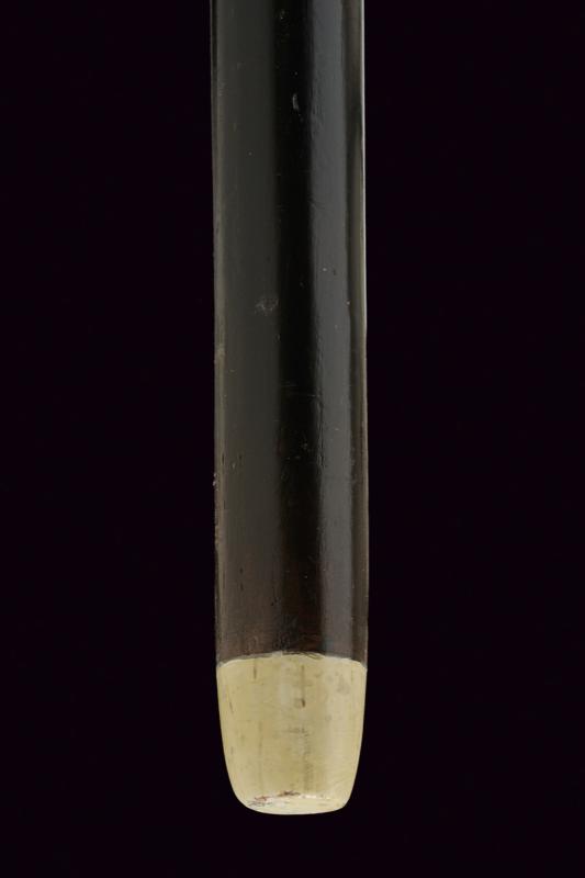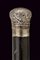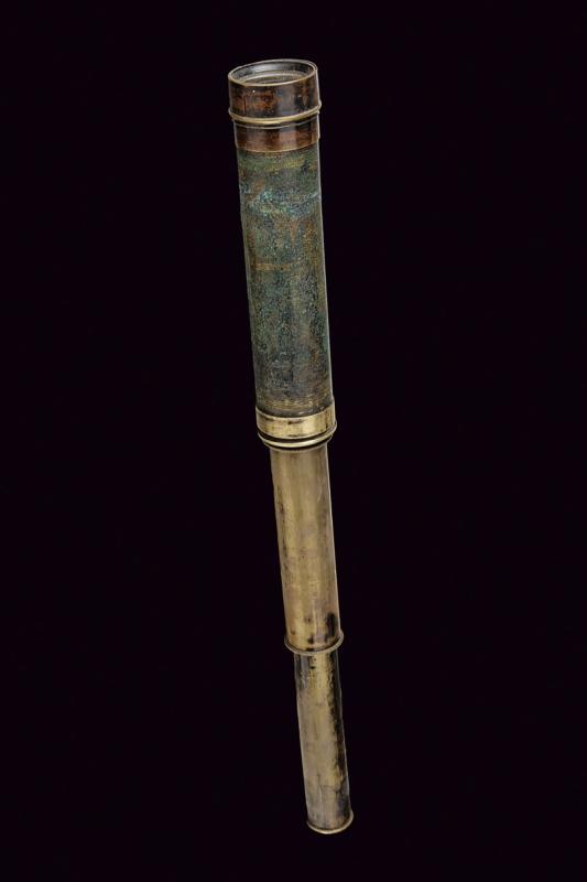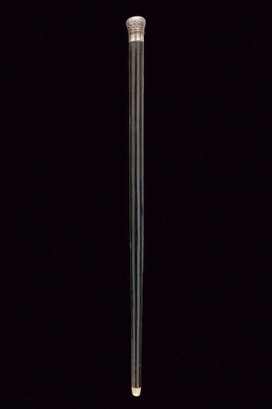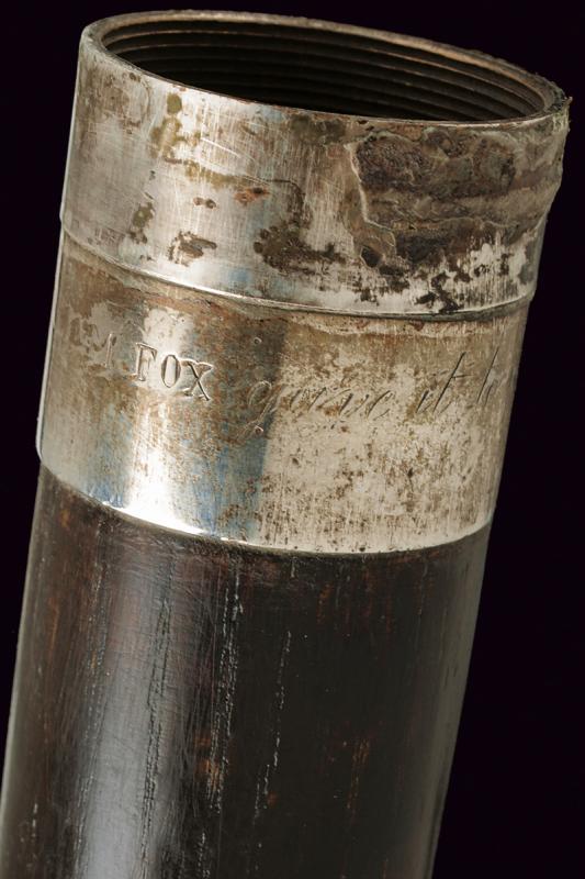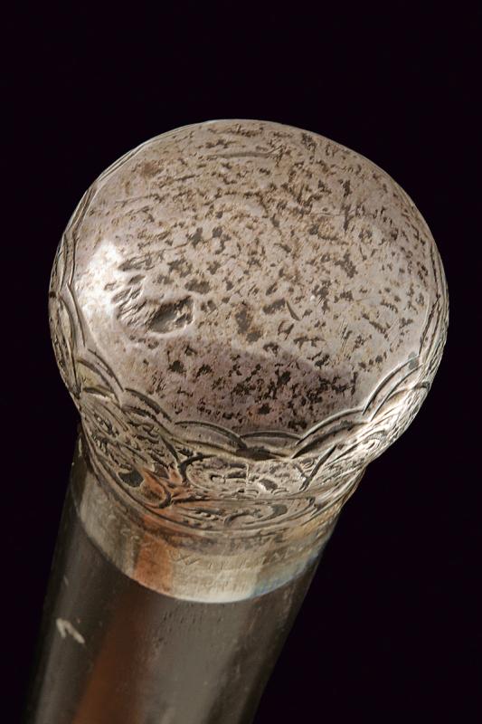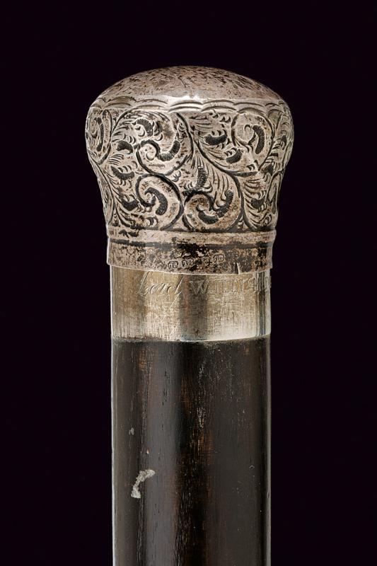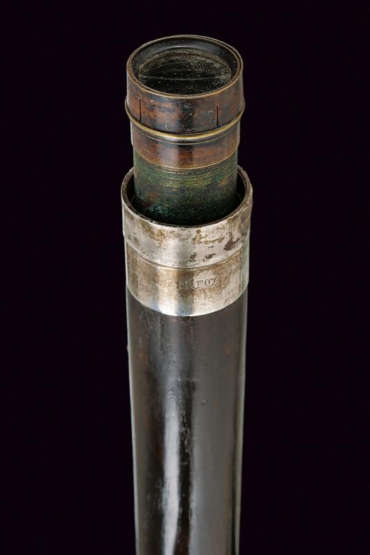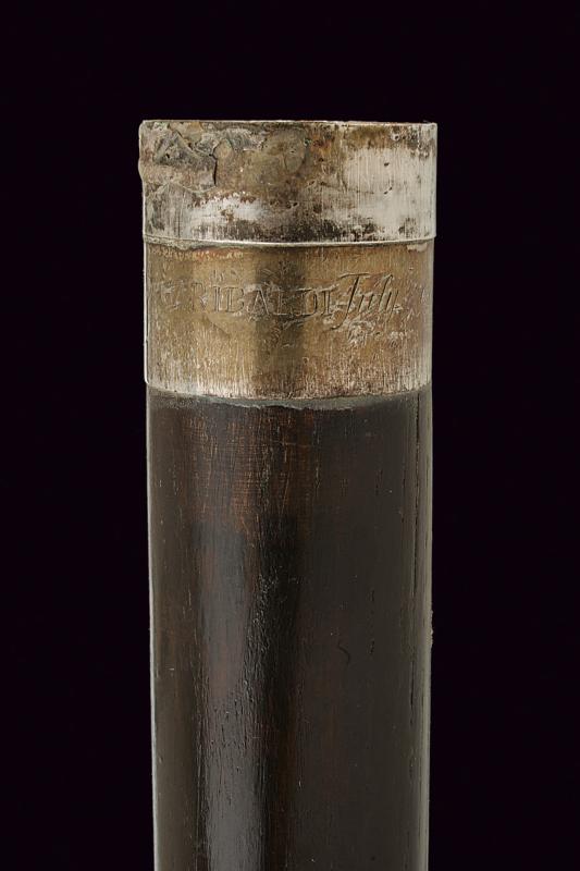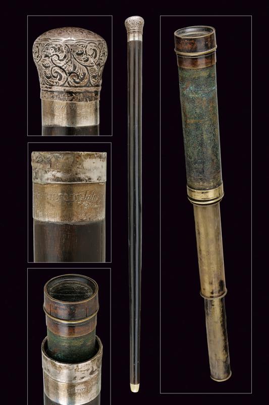Bastone da passeggio con cannocchiale , datazione: fine del XVIII Sec. provenienza: Inghilterra, Pomo in argento, inciso a motivi floreali e munito di punzoni inglesi. Il bastone in legno con doppia ghiera, quella più bassa con dedica 'Lord William Fox gave it to GARIBALDI July....' (la data illeggibile). All'interno un cannocchiale a tre ordini. Puntale in osso. lunghezza 93.5 cm.