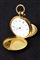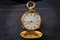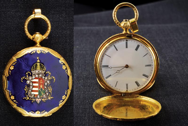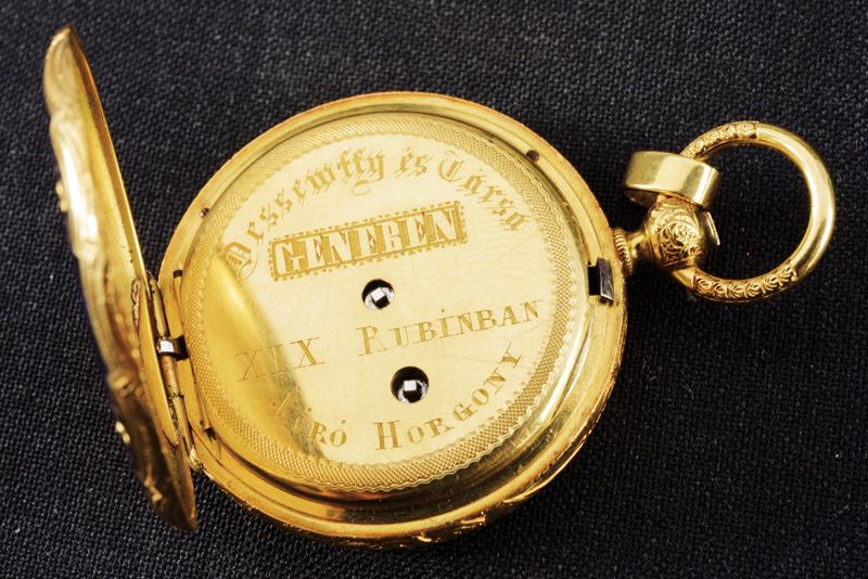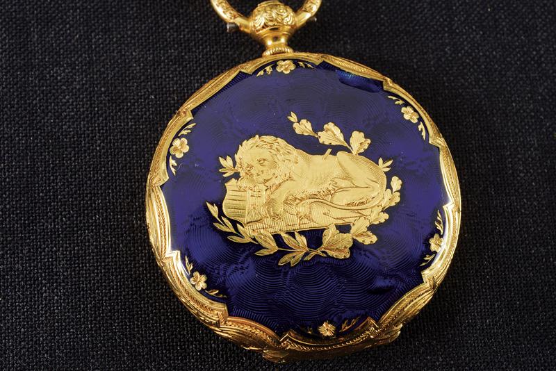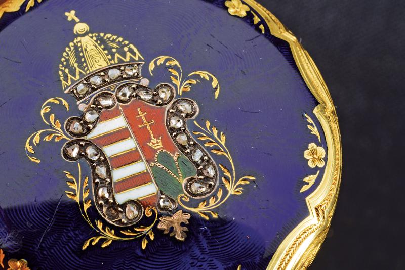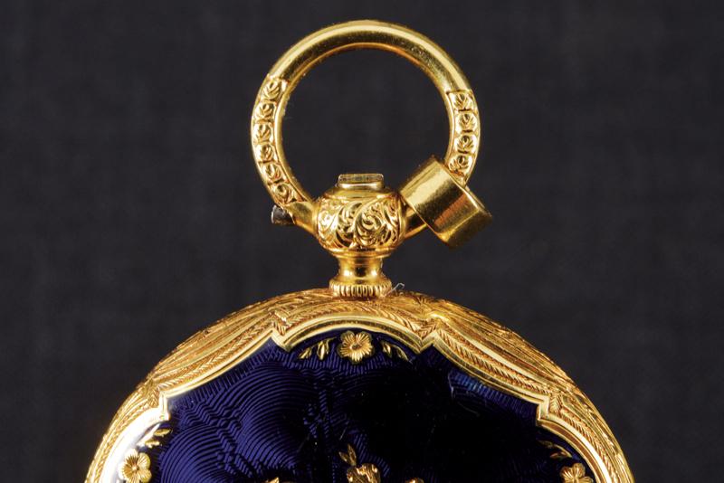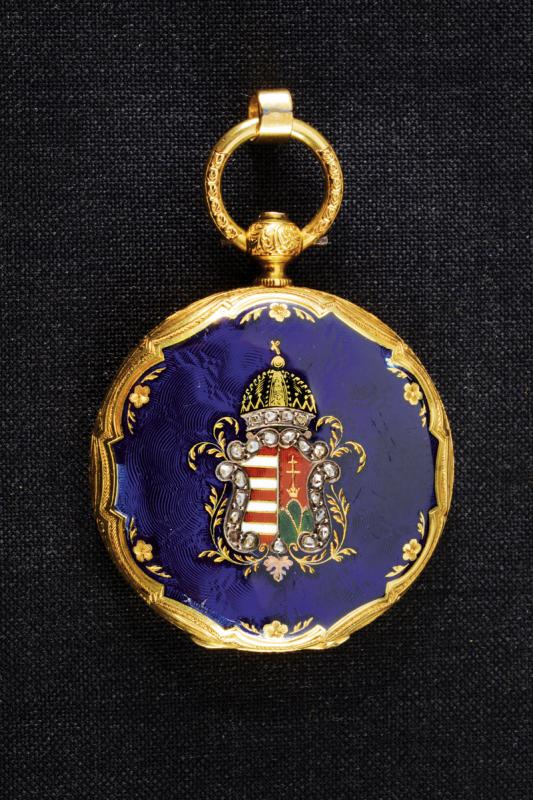 Bellissimo orologio da tasca, datazione: Fine del XIX Secolo provenienza: Ungheria, In oro giallo, il coperchio anteriore smaltato con stemma reale ungherese in oro e brillanti su fondo cobalto (piccolo chip), il coperchio posteriore finemente inciso con leone posato su stemma ungherese sempre su fondo smaltato color cobalto. Quadrante bianco con numeri romani neri. Il coperchio posteriore con numero e punzoni, quello interno con firma 'GENFBEN' e altre iscrizioni in ungherese, due aperture per il caricamento a chiave. Con anello e piccola ghiera per una catenina. diametro 3.5 cm.