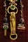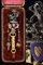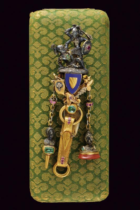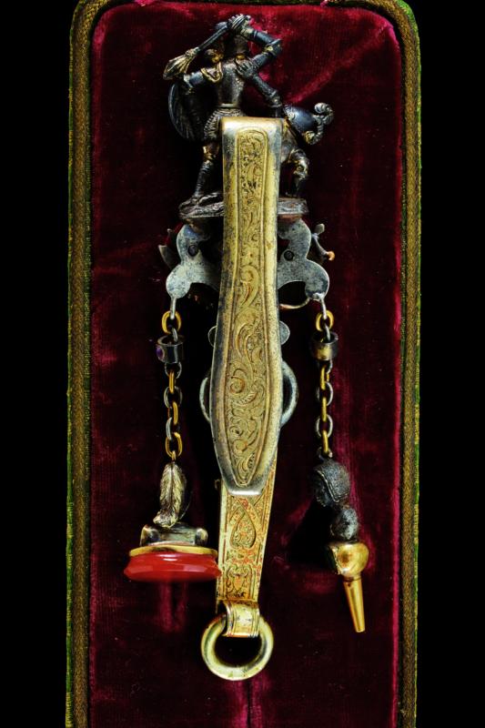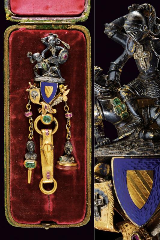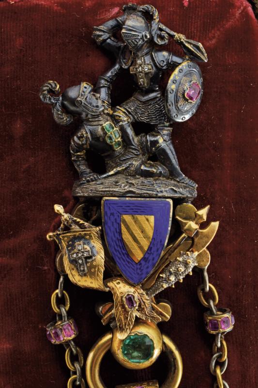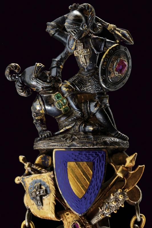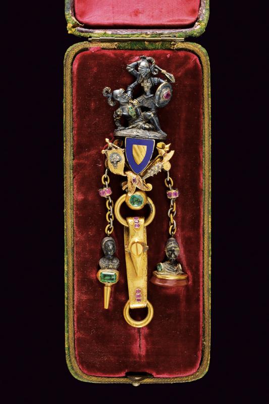 Bellissimo pendente massonico, datazione: XIX Secolo provenienza: Europa, In argento parzialmente dorato ed ornato con pietre dure, la parte superiore formata da due cavalieri in combattimento, quello superiore con mazza e scudo, sotto un scudo smaltato fra bandiera con croce e mazza e ascia da guerra, il pendente centrale inciso, ai fianchi due catenine, una con busto di donna nobile con chiave da orologio, l'altro con busto da cavaliere con elmo con gemma di sigillo (senza incisione). Su spilla larga ed in astuccio originale. altezza 11.7 cm.