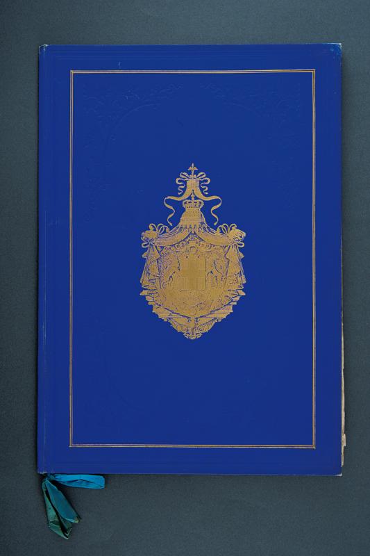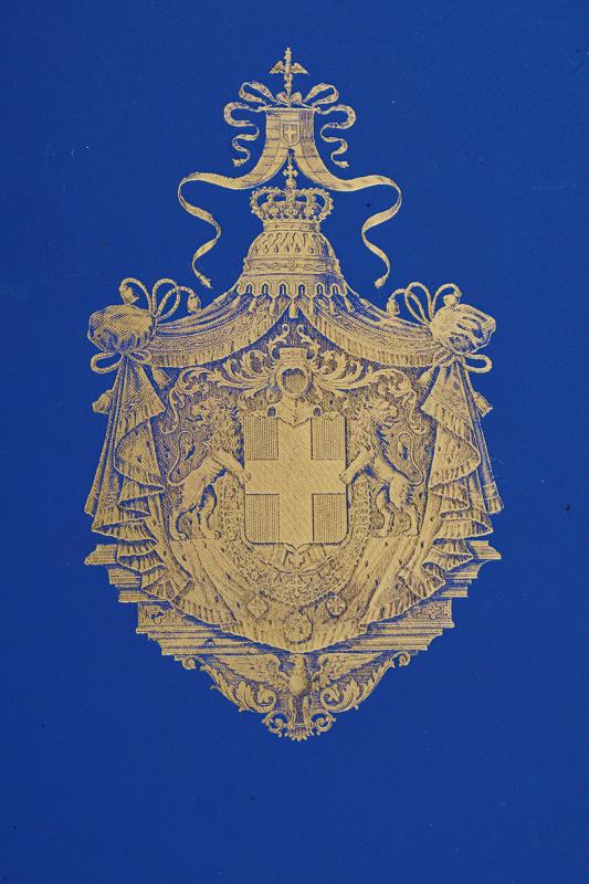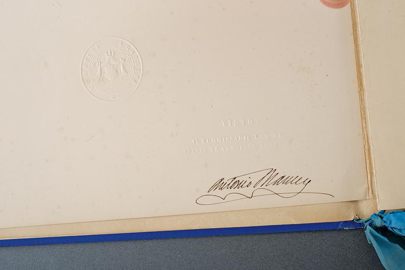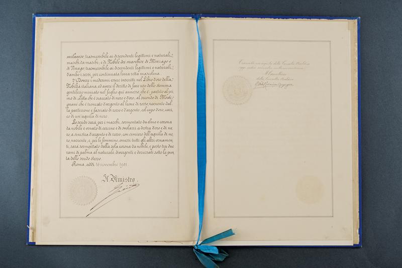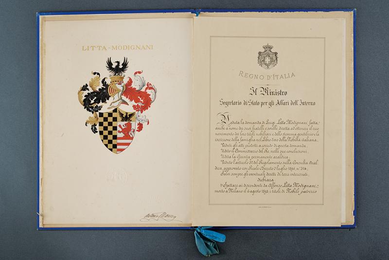 Diploma di nobiltà, datazione: 1901 provenienza: Regno d'Italia, Per i figli e figlie di Alfonso Litta Modignani. Ai figli maschi il titolo di nobile Patrizio milanese, ai fratelli e figlie il titolo nobile di Marchesi di Menzago e Vinago. Lo stemma uguale per maschi e femmine, con da differenza i maschi portano lo stemma sormontato da elmo e corona, le femmine senza elmo ma con corona. Due pagine testo scritto a mano, con firma e timbro del Ministro, firma e timbro anche del Cancelliere della Consulta Araldica. Una pagina con stemma a colori e oro con timbro e nome 'LITTA - MODIGNANI' in oro. La copertina con stemma sabaudo in oro su fondo blu decorato con impressioni floreali. dimensioni 27.5 x 39 cm.