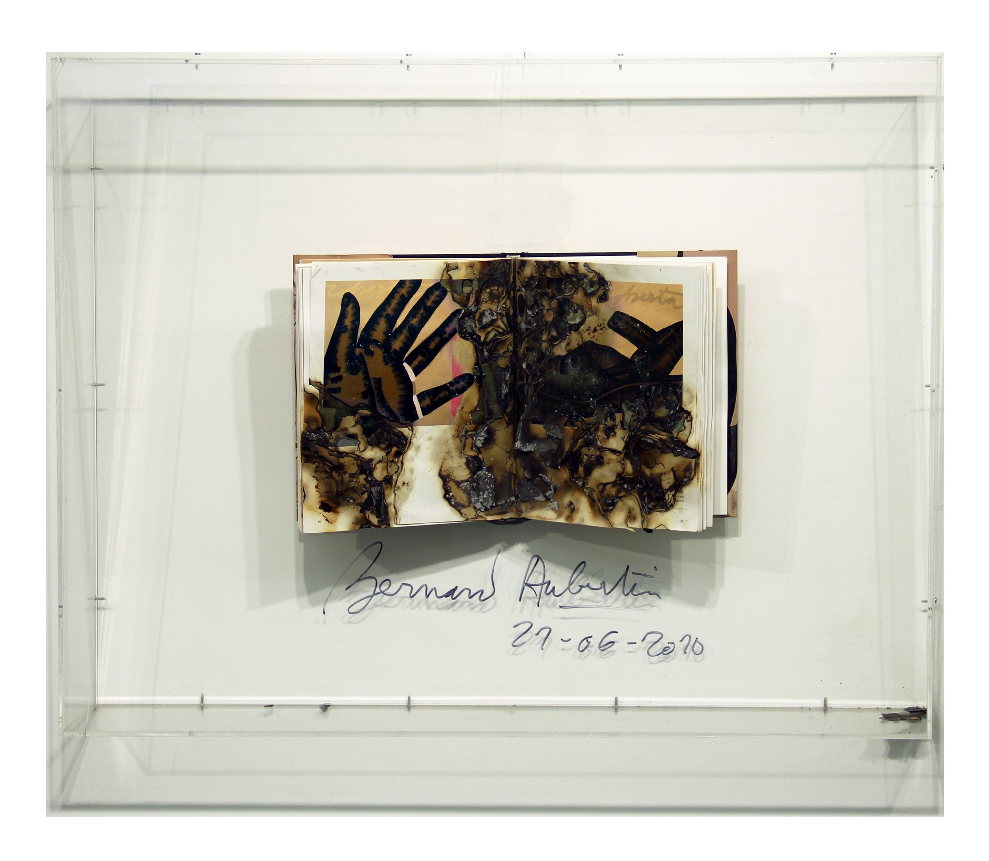 Bernard AUBERTIN, L'Art Brulée, 2010, libro d'arte bruciato in teca di plexiglass, cm. 60x80x10