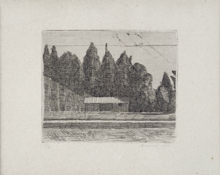 Giorgio Morandi (Bologna, 1890 - 1964) Campo da tennis ai giardini Margherita a Bologna, 1921 Acquaforte, mm. 185x243 (foglio), mm. 113x137 (lastra), es. 13/30 Firma e data in basso a destra, tiratura in basso a sinistra. Sul verso (sulla cornice): etichetta La Casa dell'Arte, Sasso Marconi. Bibliografia: L. Vitali, l'opera grafica di Giorgio Morandi, Einaudi Editore, Torino, 1964, tav. 11; M. Cordaro, Morandi Incisioni Catalogo Generale Electa Milano 1991, n° 1921-6 pag. 11