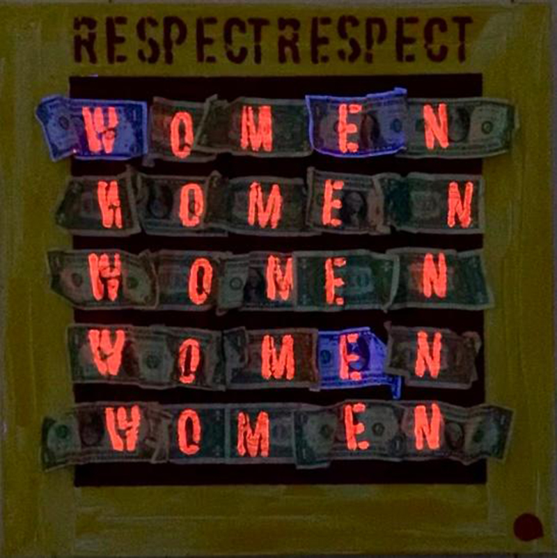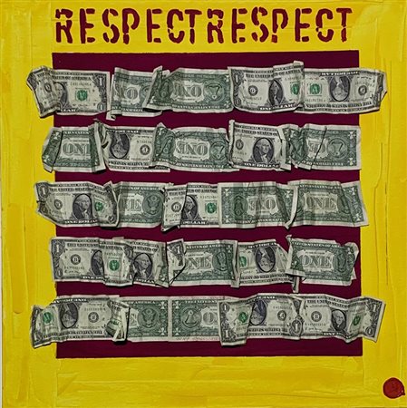 Tecnica mista con colore acrilico giallo e rosso su tela con applicazione di banconote da 1 $ - Con luce wood appaiono scritte con colore fotosensibile rosso