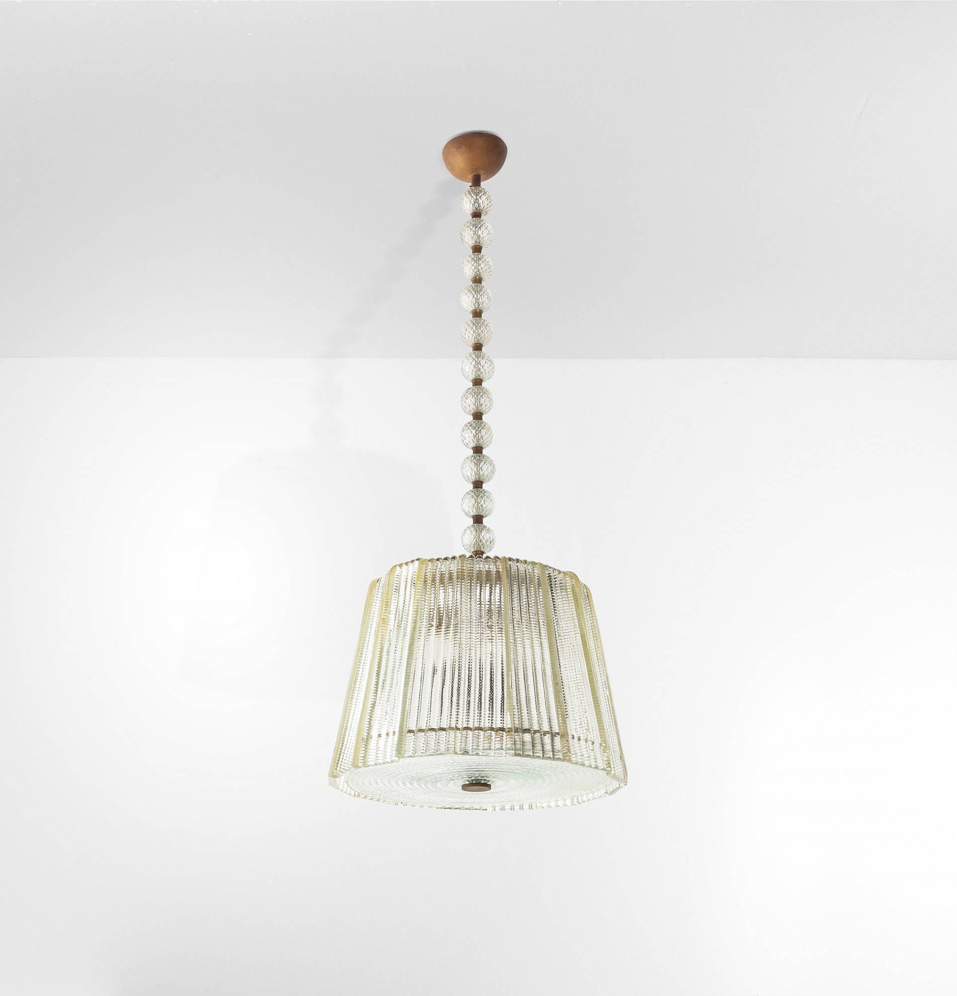Carlo Scarpa, Lampada a sospensione con struttura in metallo e vetro di Murano bugnato., Prod. Venini, Italia, 1939, W. 50 - D. 50 - H. 123 cm, Bibliografia, Catalogo Blu, scheda 179