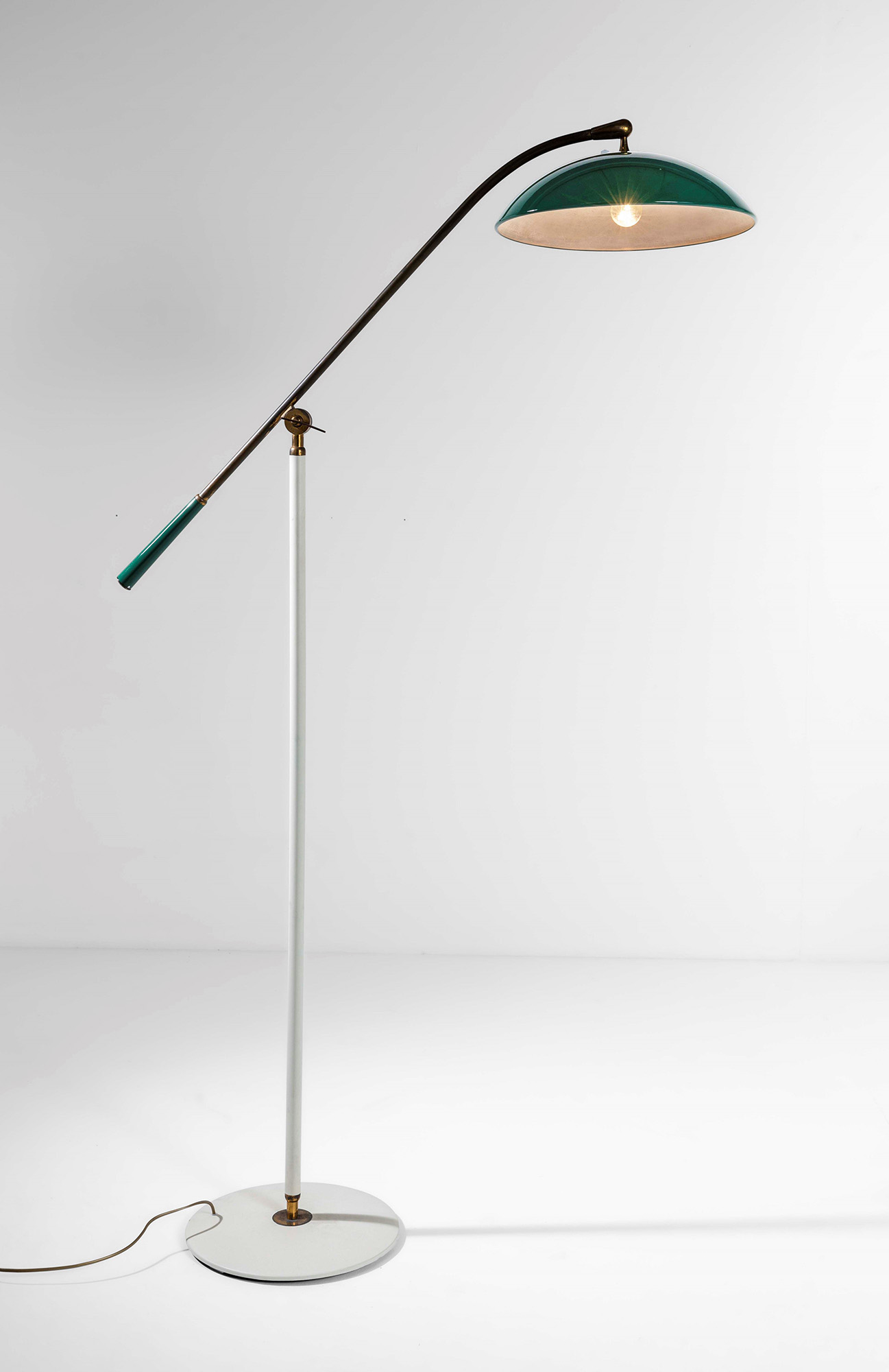 Angelo Ostuni, Lampada da terra mod. 322 orientabile con struttura in ottone e metallo laccato. Diffusore in alluminio laccato. Base in marmo., Prod. Oluce, Italia, 1950 ca., W. 51 - D. 38 - H. 209 Cm, Bibliografia , T. Braeuniger, O-Luce di Giuseppe Ostuni: Catalogo Ragionato, p. 291, Vol II, Lumi Press, 2021 (modello simile)