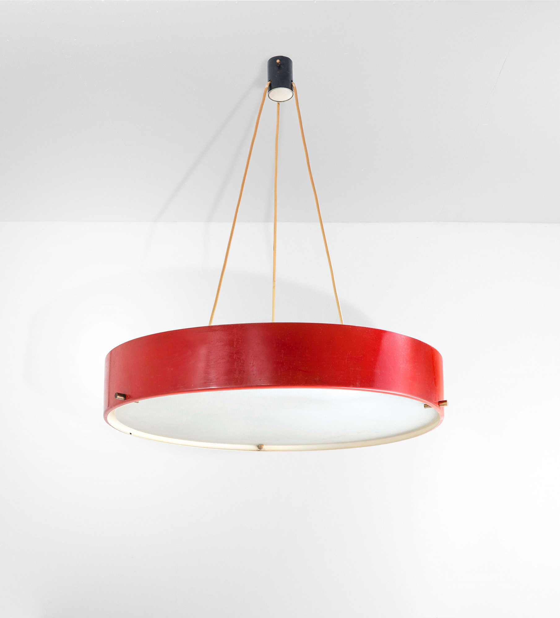 Stilnovo, Lampada a sospensione con struttura in ottone ed alluminio laccato. Schermo diffusore in vetro satinato., Etichetta originale., Prod. Stilnovo, Italia, 1950 ca., W. 60 - D. 60 - H. 67 cm