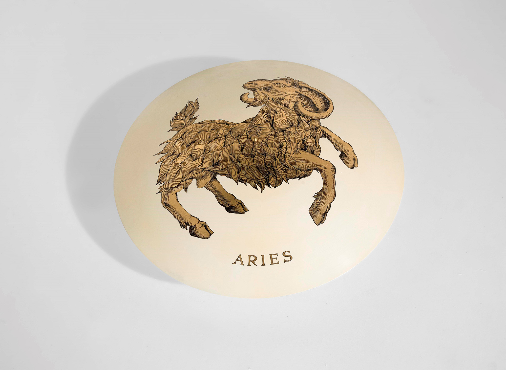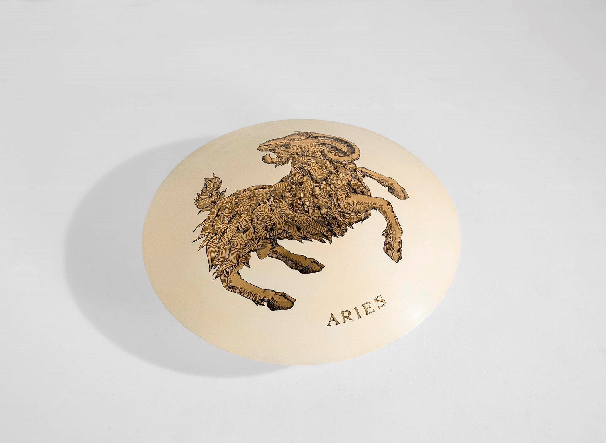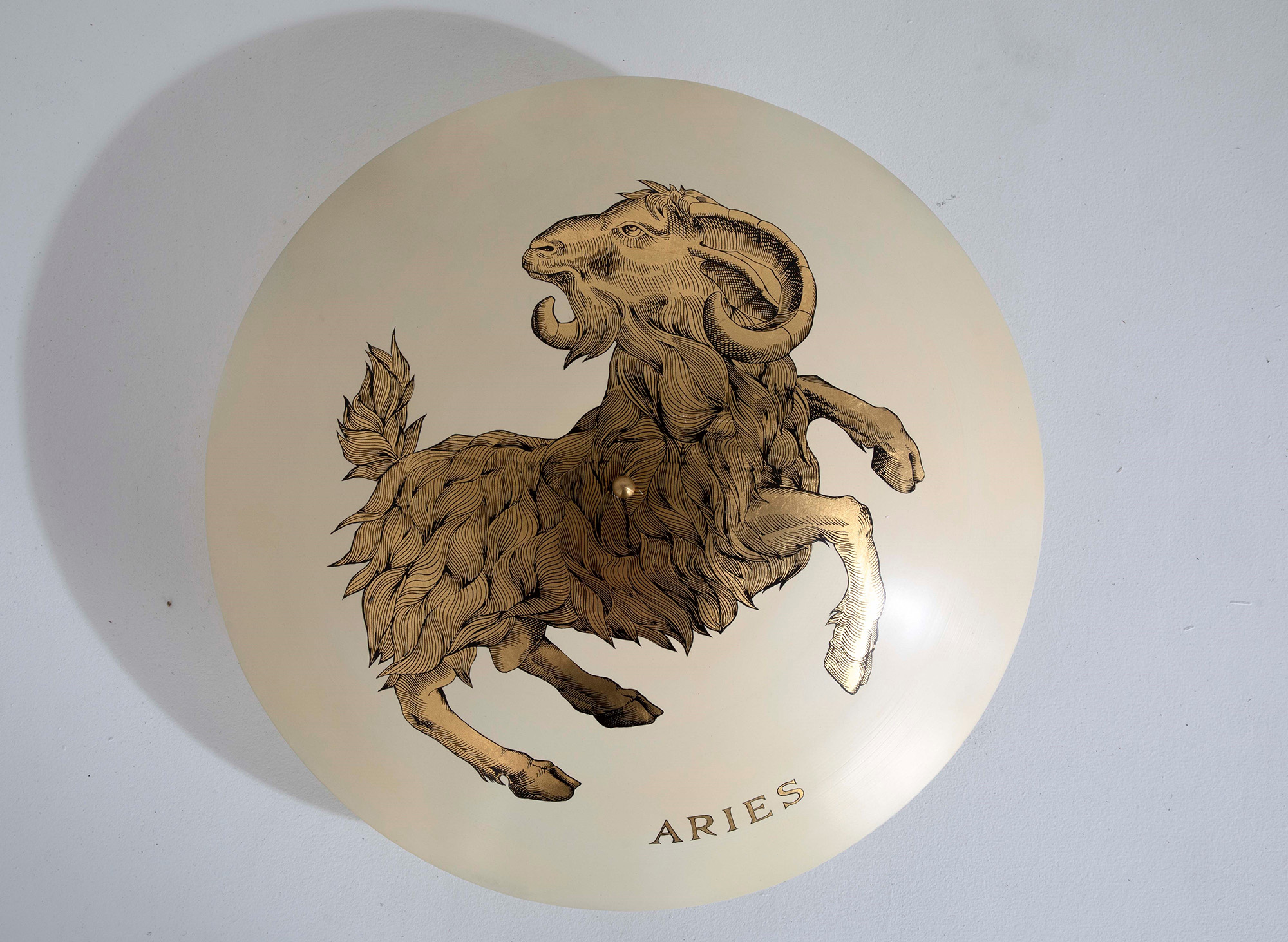 Piero Fornasetti, Lampada a plafone mod. Aries con struttura in metallo laccato decorato con la tecnica della decalcomania. , Prod. Fornasetti, Italia, 1960 ca., W. 67 - D. 67 - H. 24 Cm