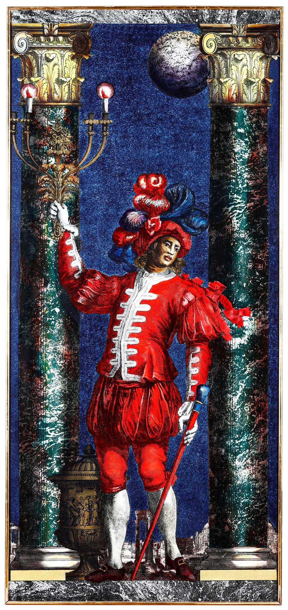Piero Fornasetti, Pannello in legno con decoro a decalcomania mod. Paggio.Prod. Fornasetti, Italia, 1960 ca., W. 97 - D. 4 - H. 210 cm