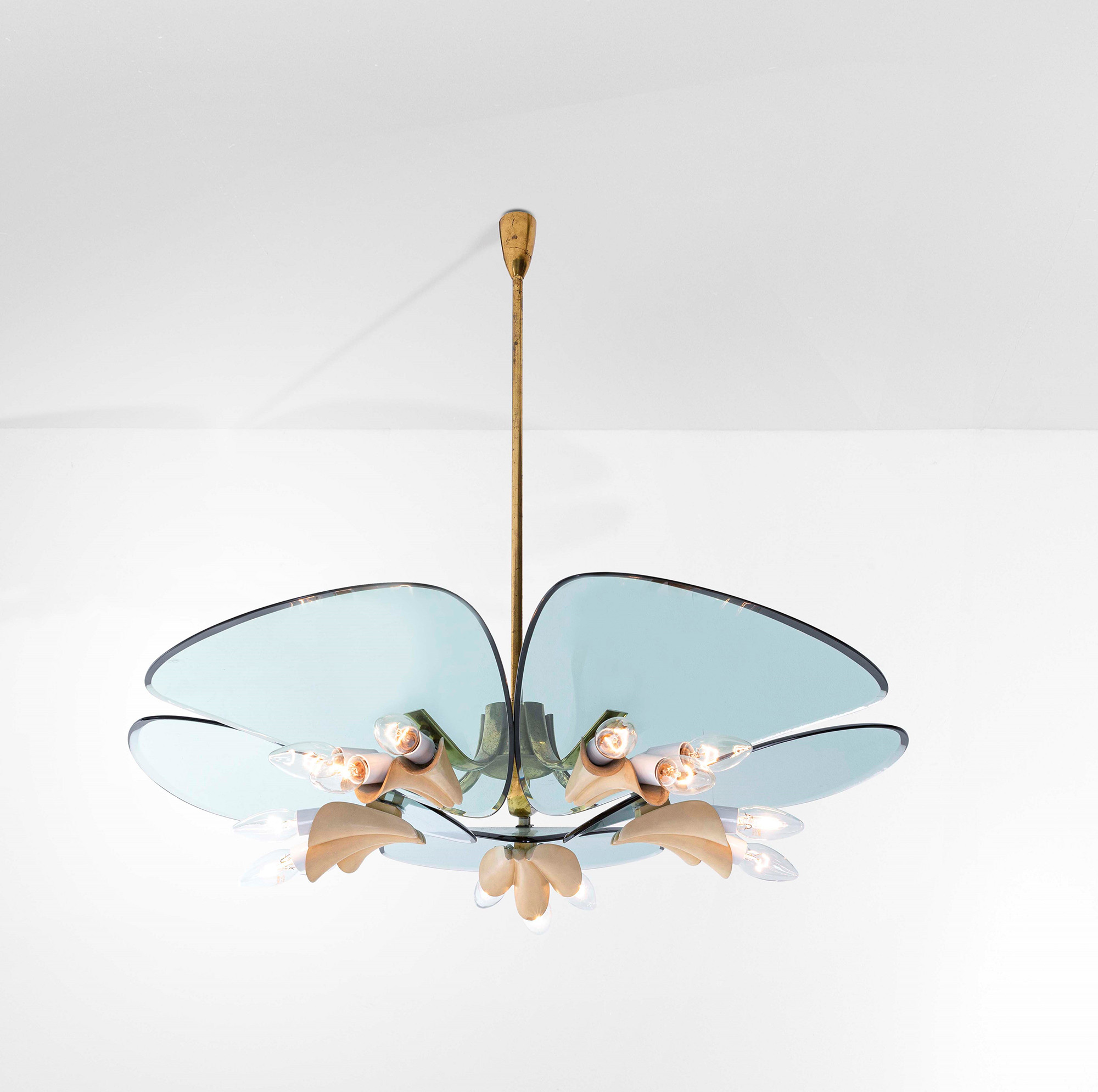 Pietro Chiesa, Lampada a sospensione con struttura in ottone ed elementi diffusori in cristallo colorato curvato e molato., Prod. Fontana Arte, Italia, 1960 ca., W. 72 - D. 72 - H. 80 cm, Bibliografia, Vitrum n. 62, p 39.