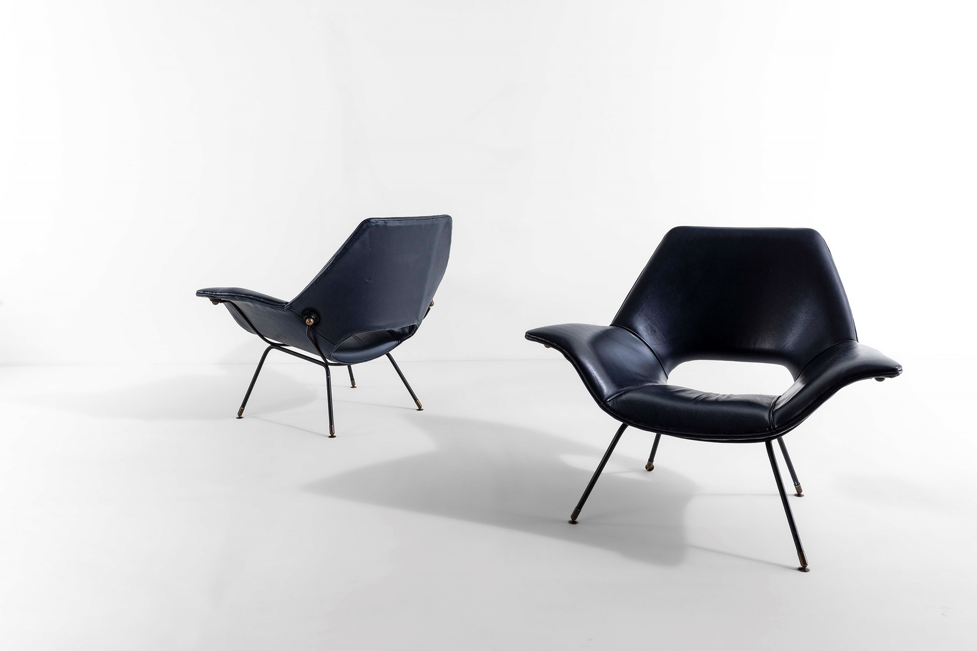 Augusto Bozzi, Coppia di poltrone con struttura in tondino di metallo laccato e compensato curvato, particolari in ottone. Rivestimenti in pelle., Prod. Saporiti, Italia, 1950 ca., W. 98 - D. 83 - H. 83 Cm