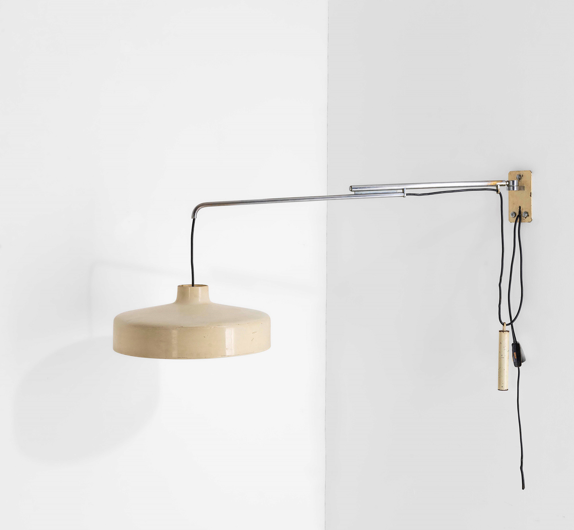 Gino Sarfatti, Lampada a parete mod. 194 con sistema saliscendi, estensibile e girevole sul piano orizzontale. Struttura in ottone cromato e diffusore in metallo laccato., Prod. Arteluce, Italia, 1950 ca., W. 40 - D. 110 - H. 50 Cm