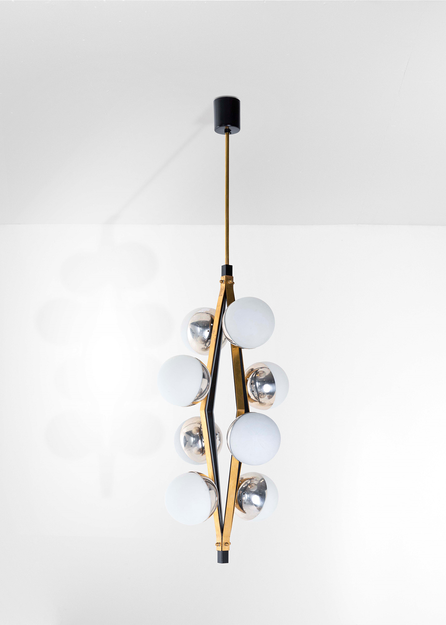 Stilnovo, Lampada a sospensione con struttura in ottone e metallo cromato. Diffusori in vetro opalino., Prod. Stilnovo, Italia, 1960 ca., W. 34 - D. 34 - H. 110 cm