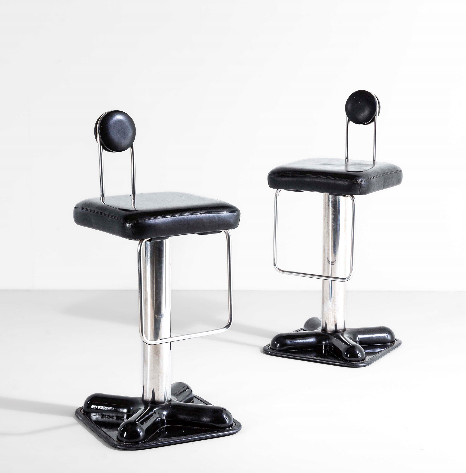 Joe Colombo, Due sgabelli girevoli mod. Birillo con struttura in metallo cromato e fibra di vetro. Rivestimenti in pelle., Prod. Zanotta, Italia, 1971, W. 47 - D. 47 - H. 104 Cm, Bibliografia, G. Gramigna, Repertorio del design italiano 1950-2000, p. 190, Allemandi, 2003.