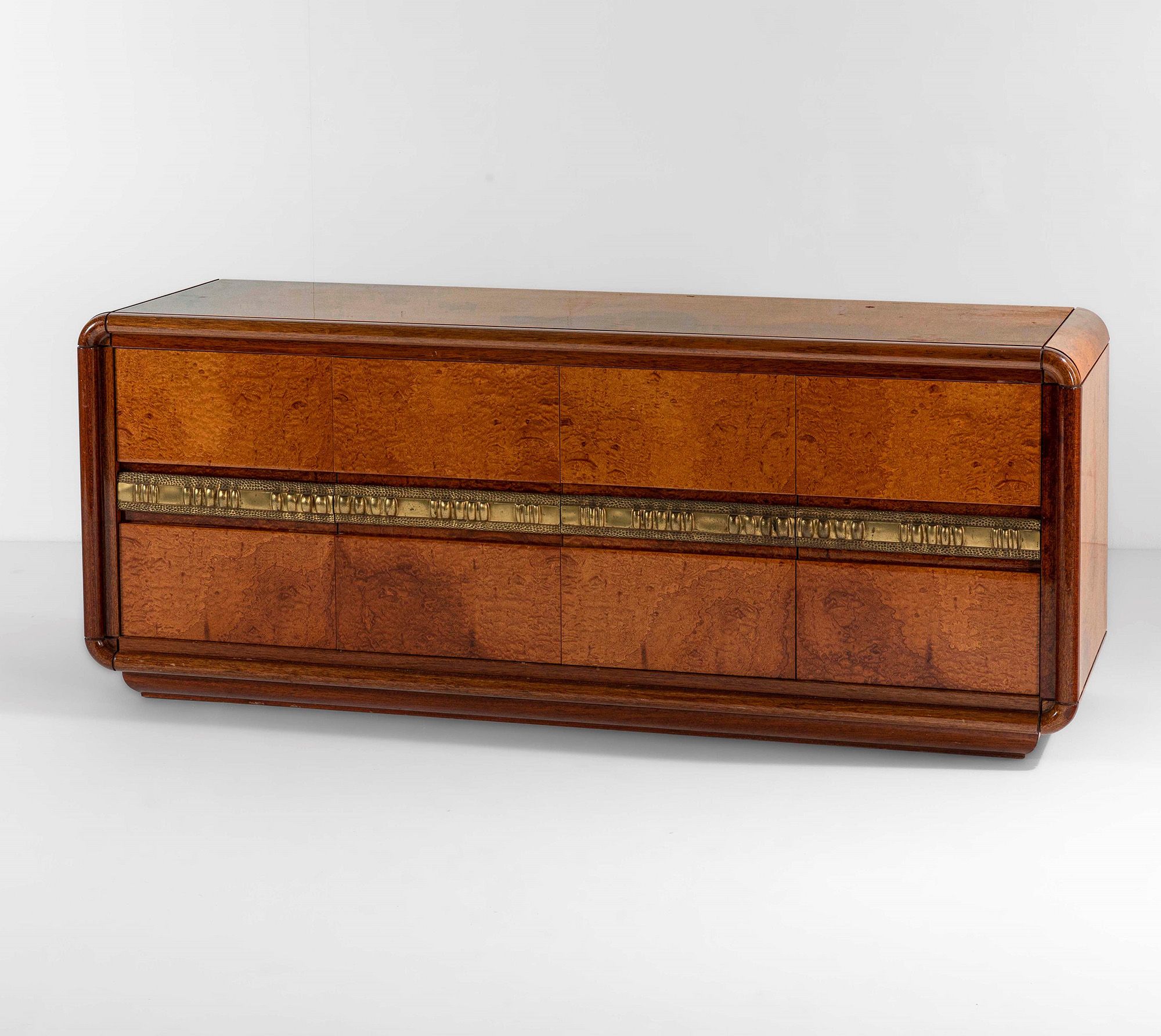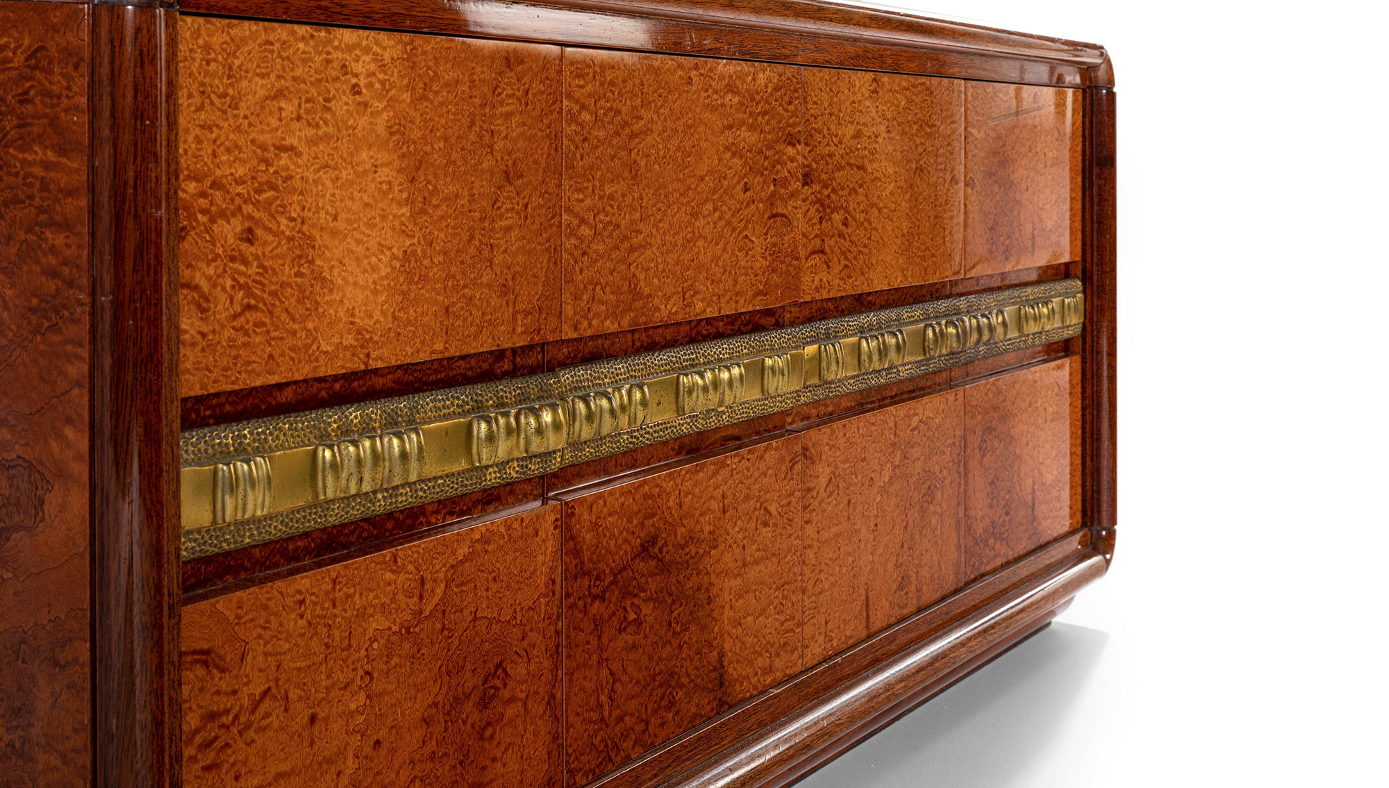 Luciano Frigerio, Mobile contenitore mod. Ilaria, struttura in legno e rivestimenti in radica. Scultura in fusione di bronzo., Prod. Frigerio di Desio, Italia, 1970 ca., W. 173 - D. 56 - H. 73 cm, Bibliografia, Catalogo originale di produzione.