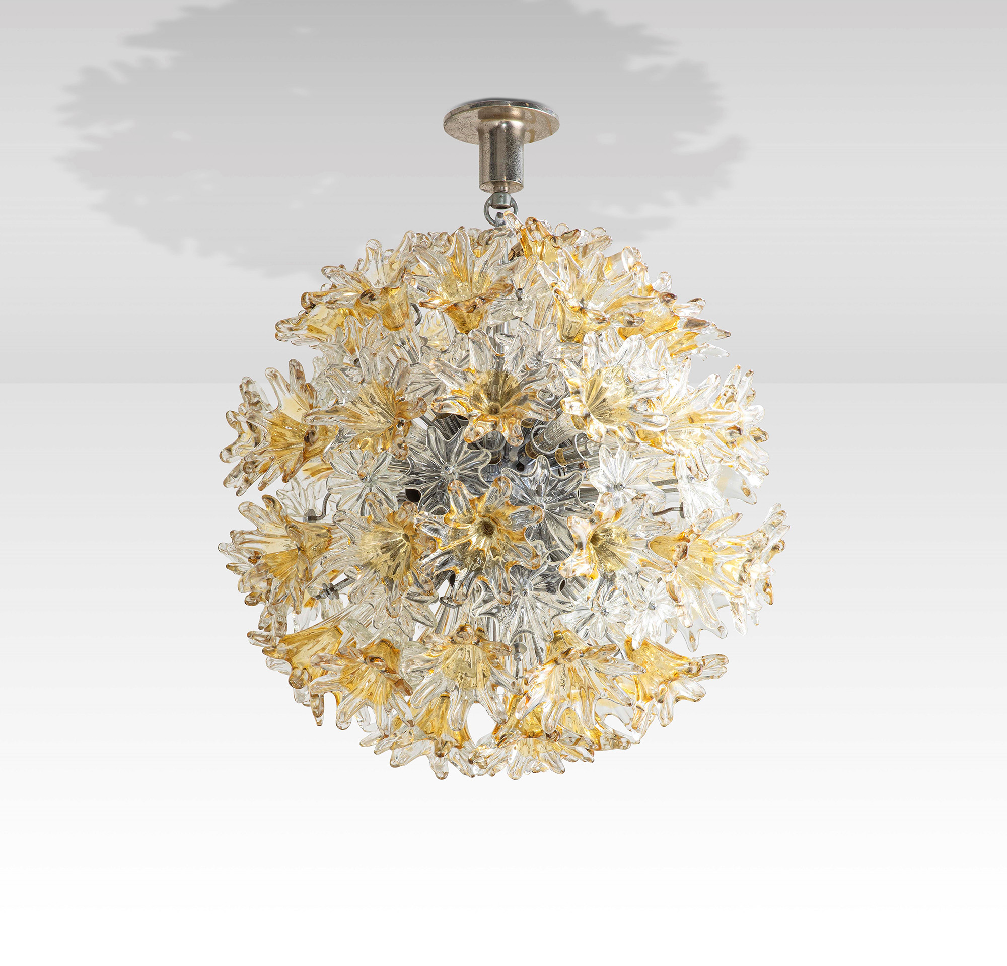 Toni Zuccheri, Lampada a sospensione mod. Esprit con struttura in metallo cromato ed elementi diffusori in vetro di Murano., Prod. Venini, Italia, 1970 ca., W. 60 - D. 60 - H. 72 cm, Bibliografia, F. Deboni, Venini, p. 70, Allemandi, 2007