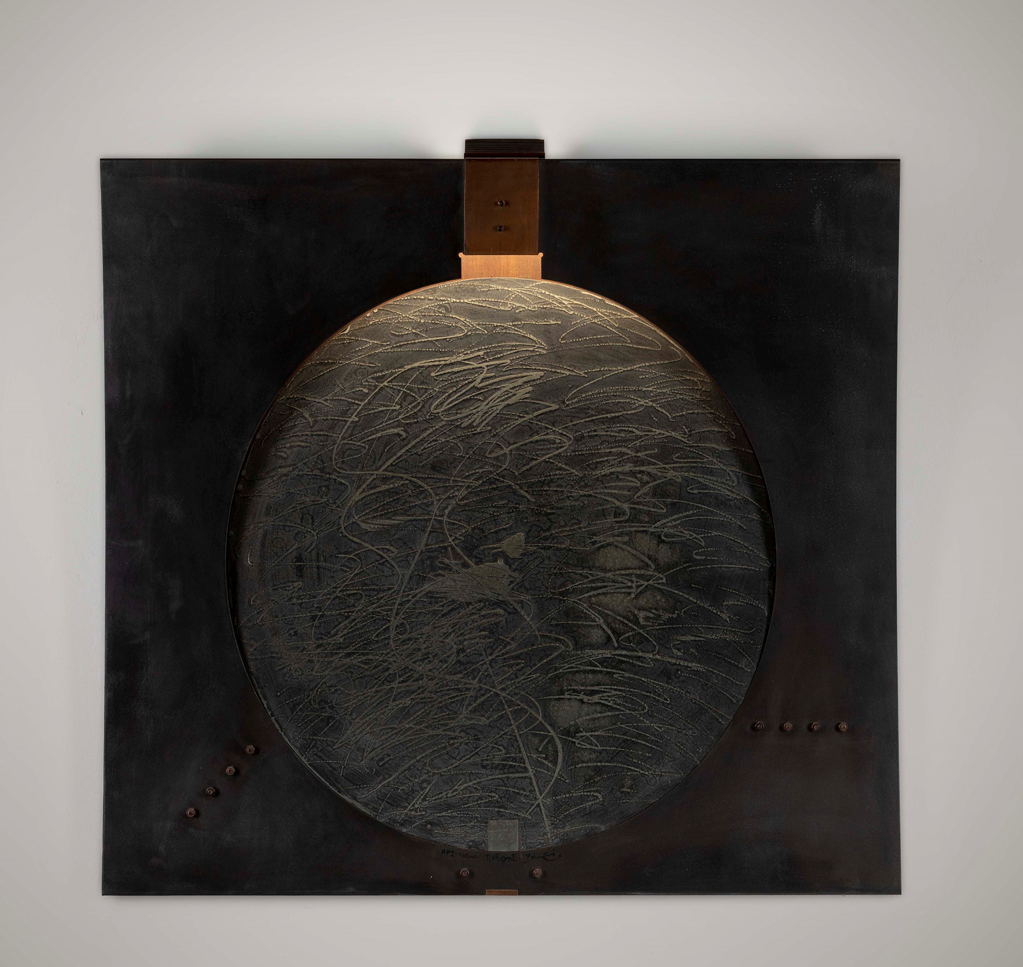 Nerone Ceccareli e Giancarlo Patuzzi - NP2, Pannello luminoso da parete mod. C3 104 LZ in metallo laccato, con incisione su zinco e particolari in rame., Firma originale, Prod. NP2, Italia, 1970 ca., W. 90 - D. 11 - H. 103 cm