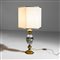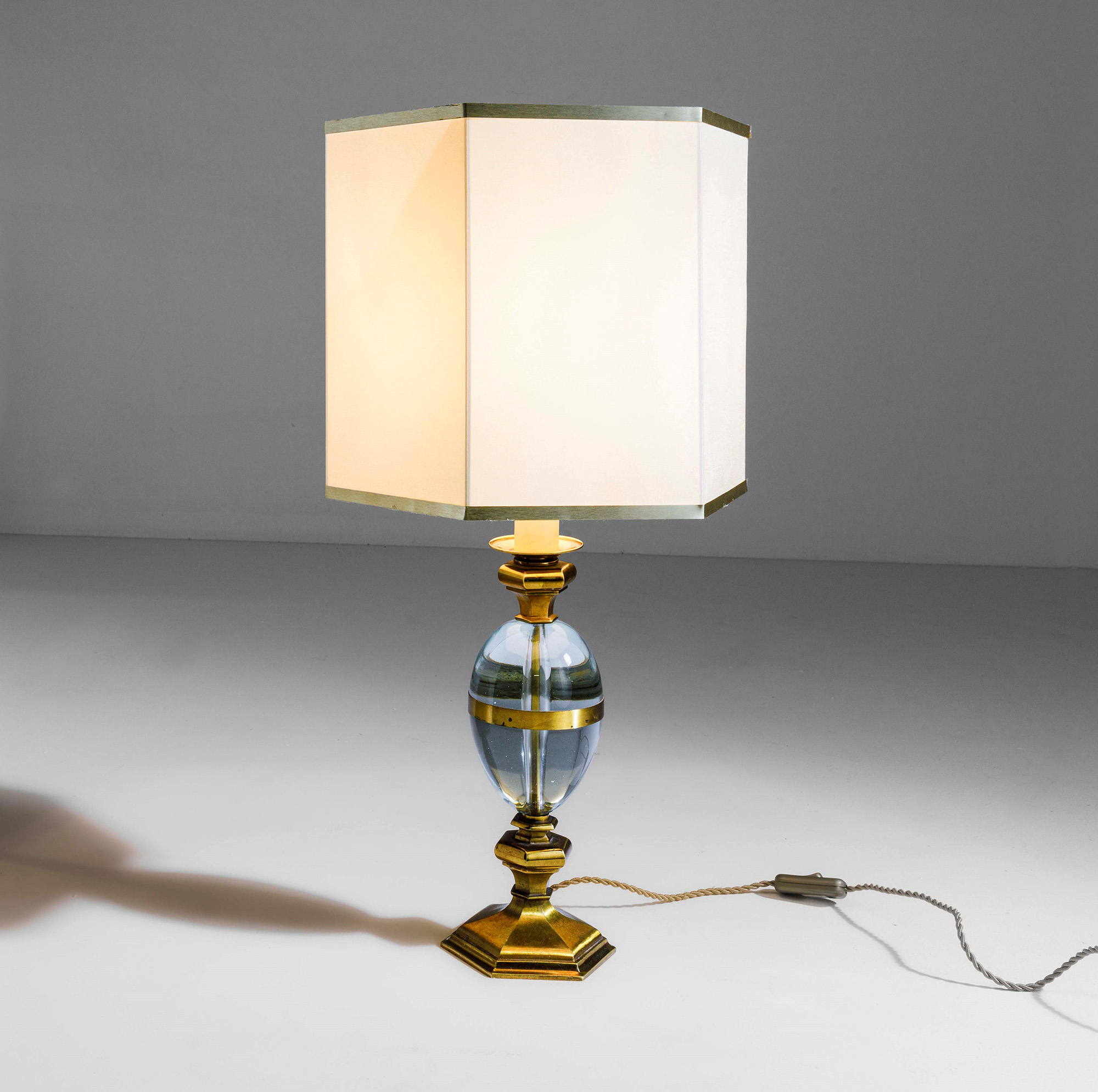 Gabriella Crespi, Lampada da tavolo con struttura in ottone e cristallo. Paralume in tessuto., Firma incussa., Prod. Italia, 1970 ca., W. 29 - D. 29 - H. 64 cm