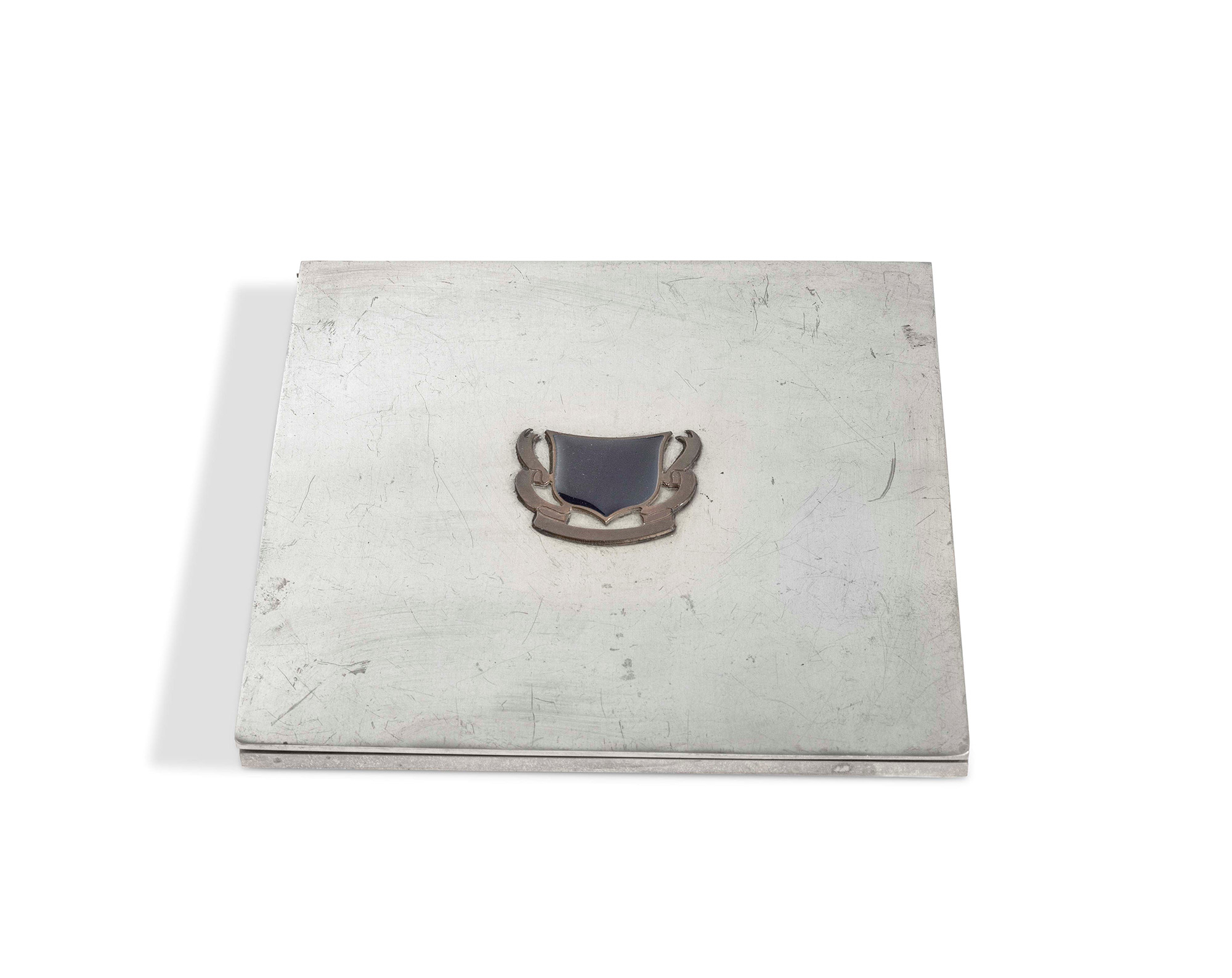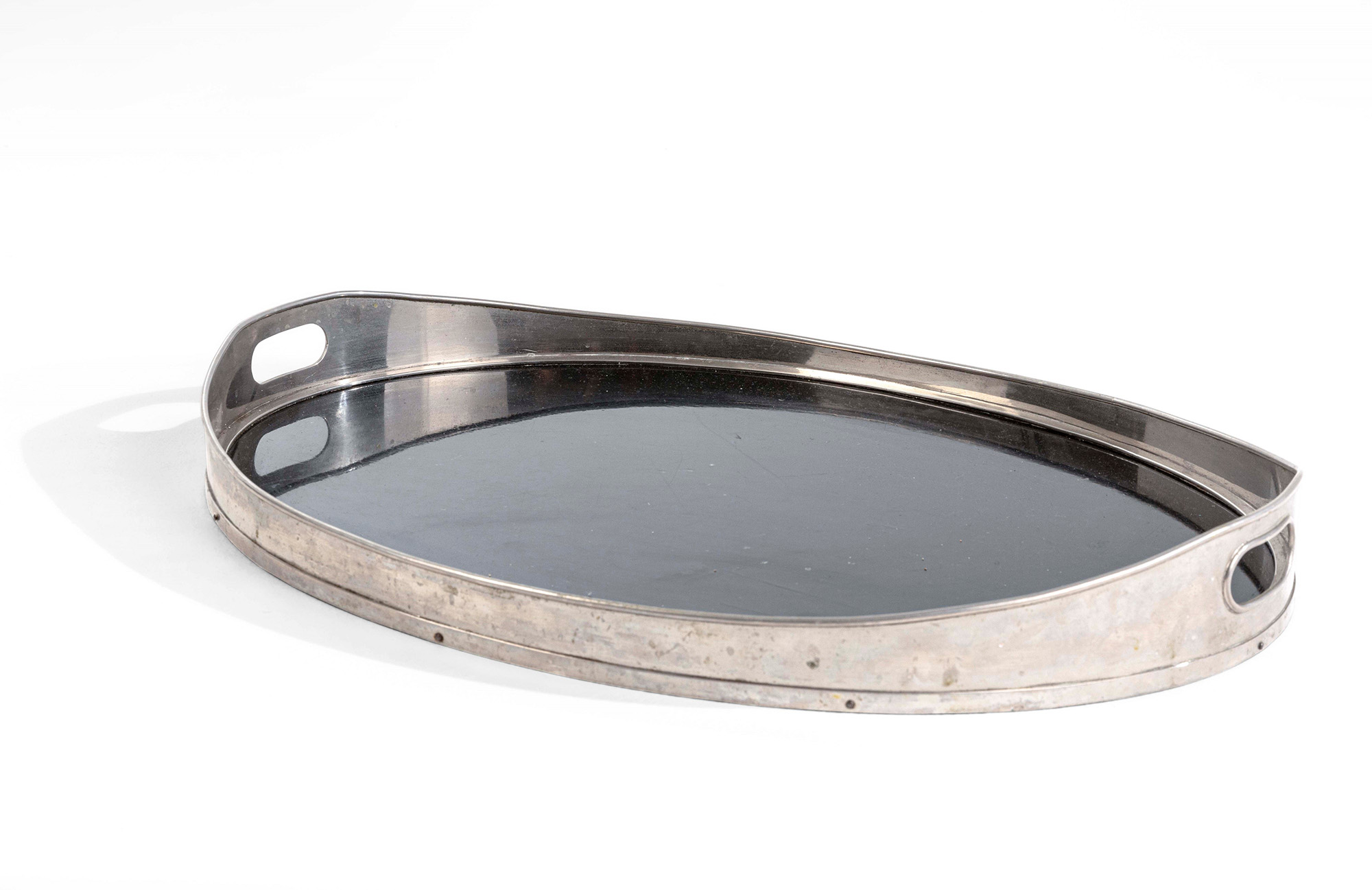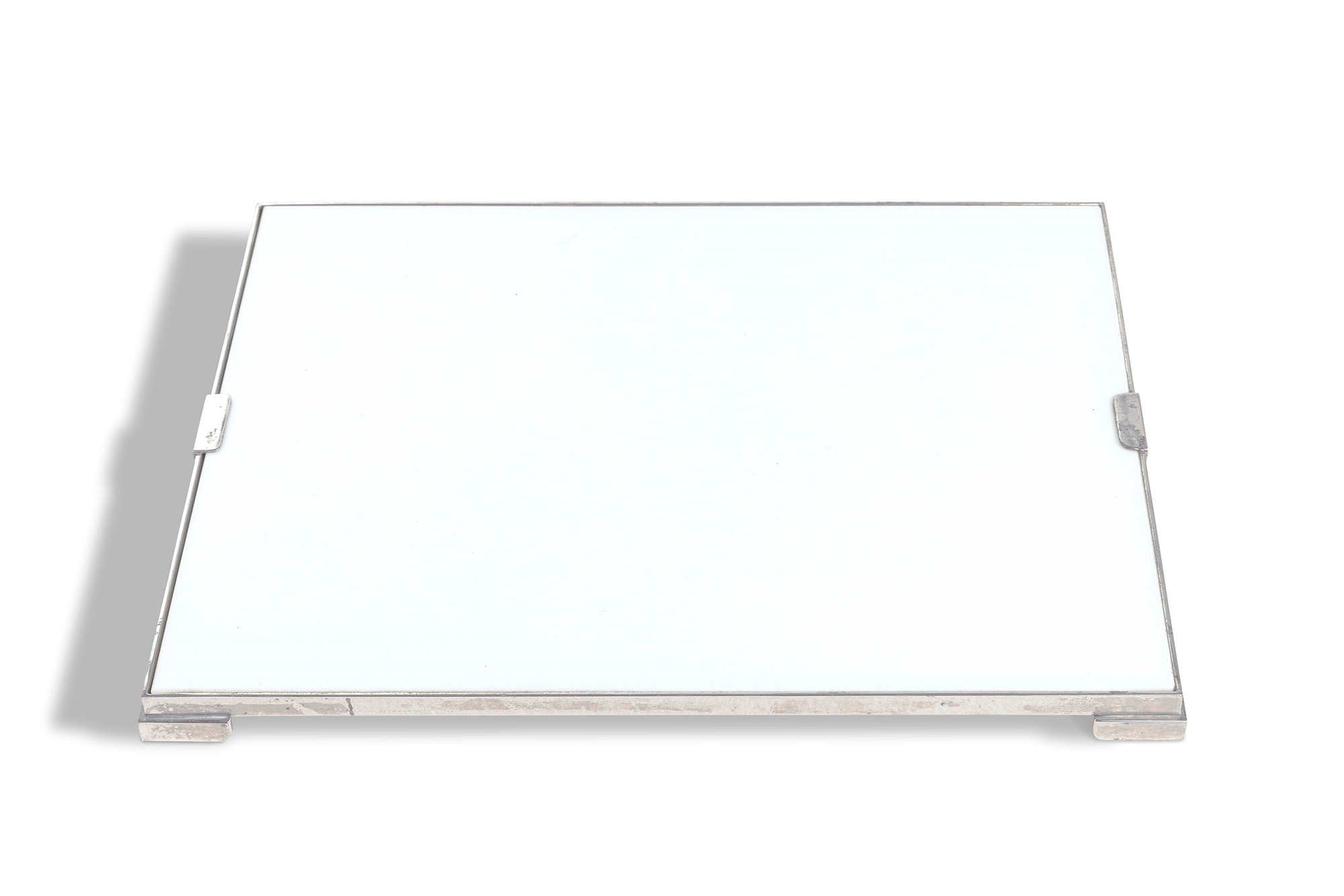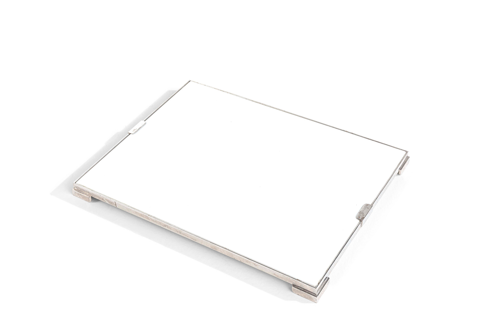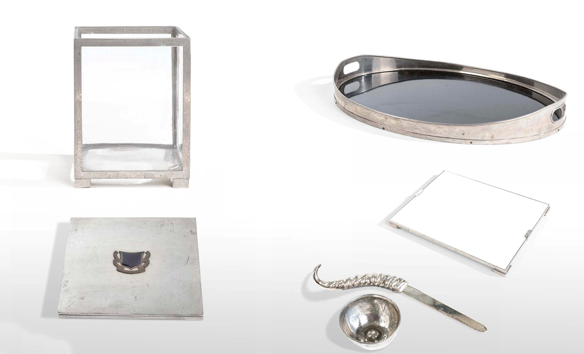 Gabriella Crespi, Set di oggetti da scrivania comprensivo di un vassoio in metallo laccato nero, un vassoio in metallo laccato bianco, un vaso, una scatola, un tagliacarte e una coppetta portaoggetti., W. 60 - D. 45 - H. 7 Cm