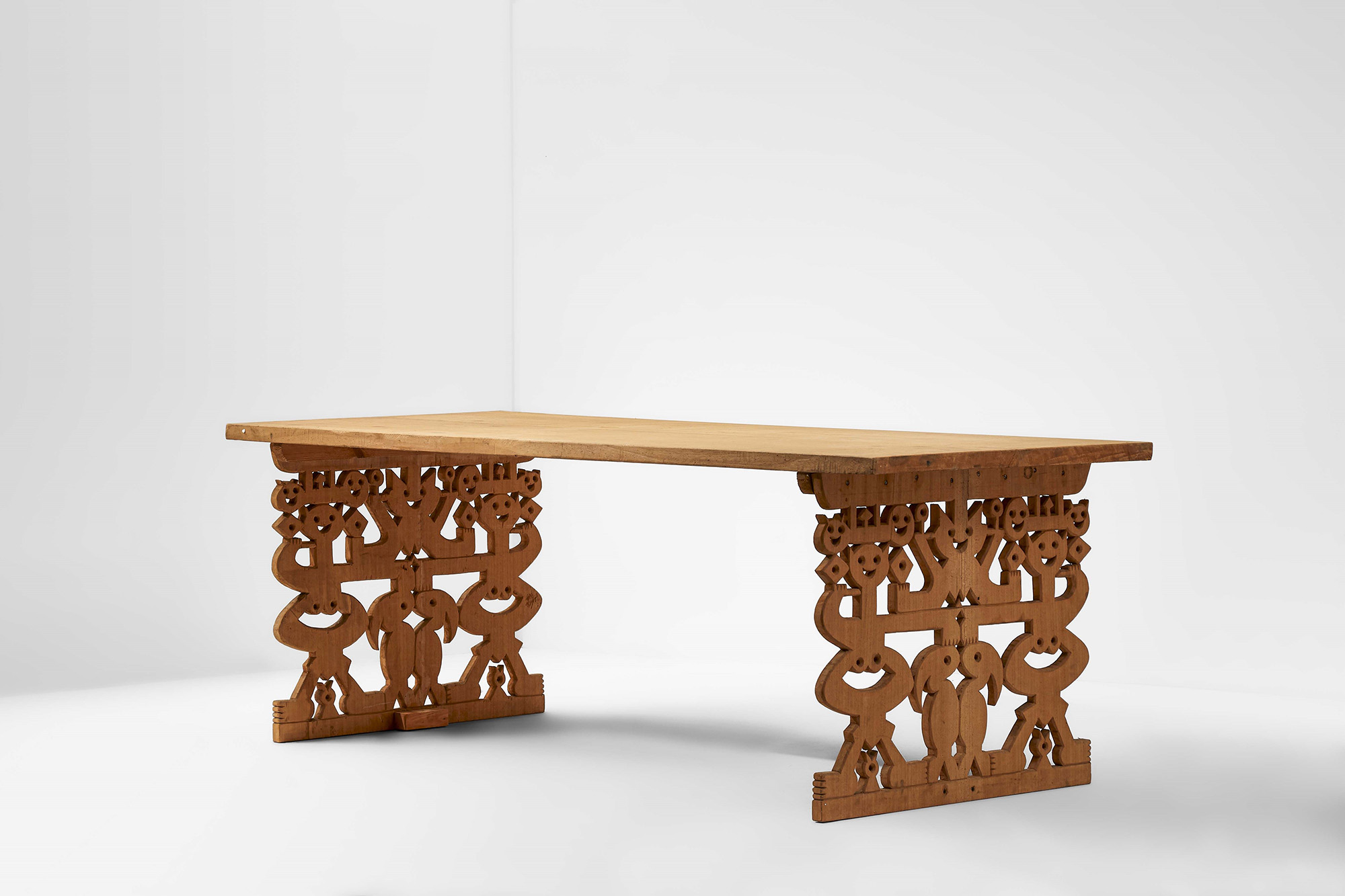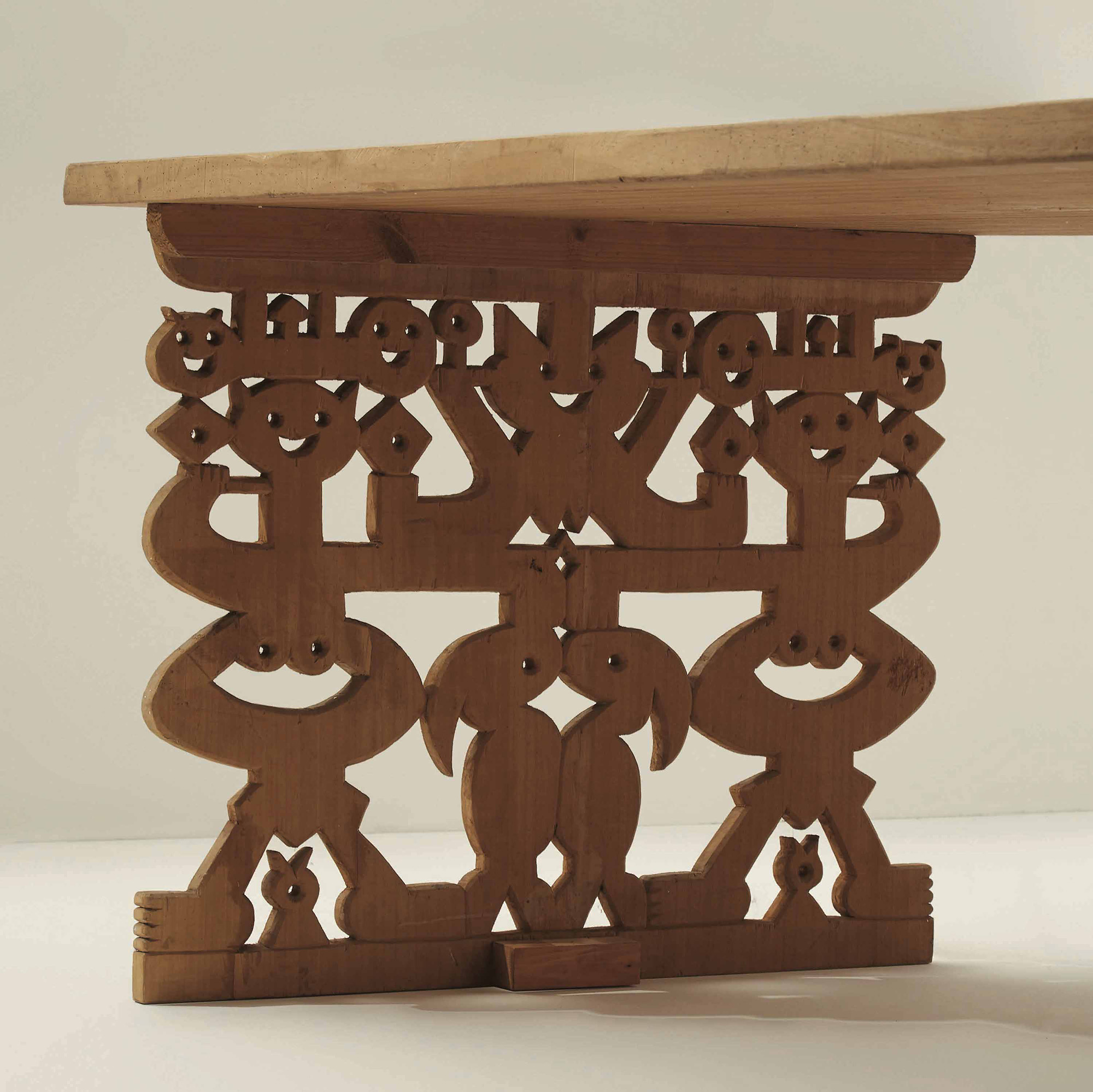 Sebastian Matta, Tavolo con struttura in legno scolpito e piano in legno. , Prod. Italia, 1970 ca. , cm 237x97x84, W. 237 - D. 97 - H. 84 cm