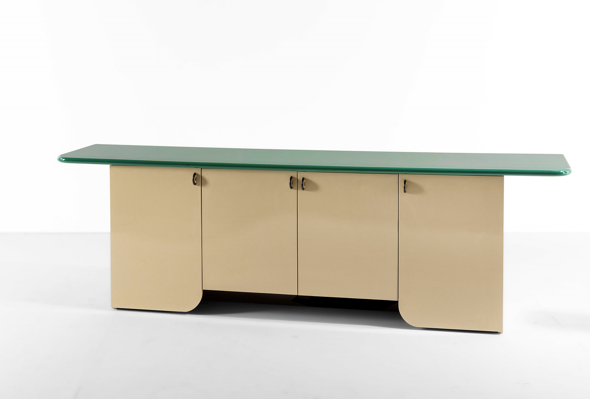 Luigi Saccardo, Mobile contenitore mod. Programma Seven con struttura in legno e laminato laccato., Etichetta originale., Prod. Prod. Gasparello, Italia, 1980 ca., W. 250 - D. 50 - H. 76 Cm, Bibliografia , Domus 607, 1980, pag. 43