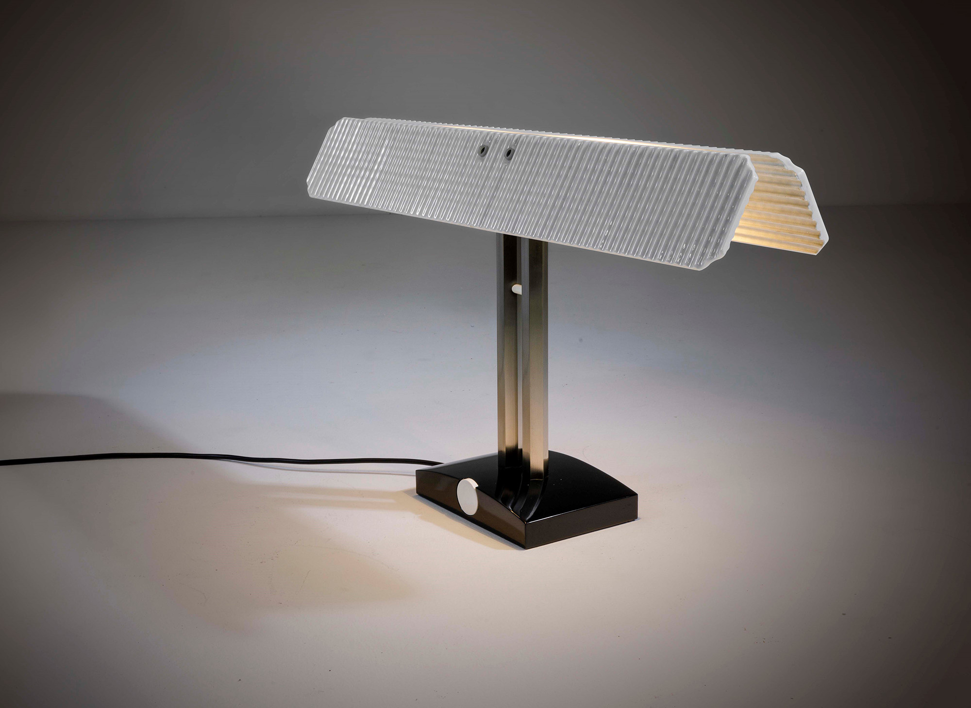 Tobia Scarpa, Lampada da tavolo mod. Capalonga con struttura in metallo e metallo laccato. Diffusore in ceramica smaltata., Prod. Flos, Italia, 1980 ca., W. 68 - D. 5 - H. 42 cm, Bibliografia, Domus n. 665 , ottobre 1985.
