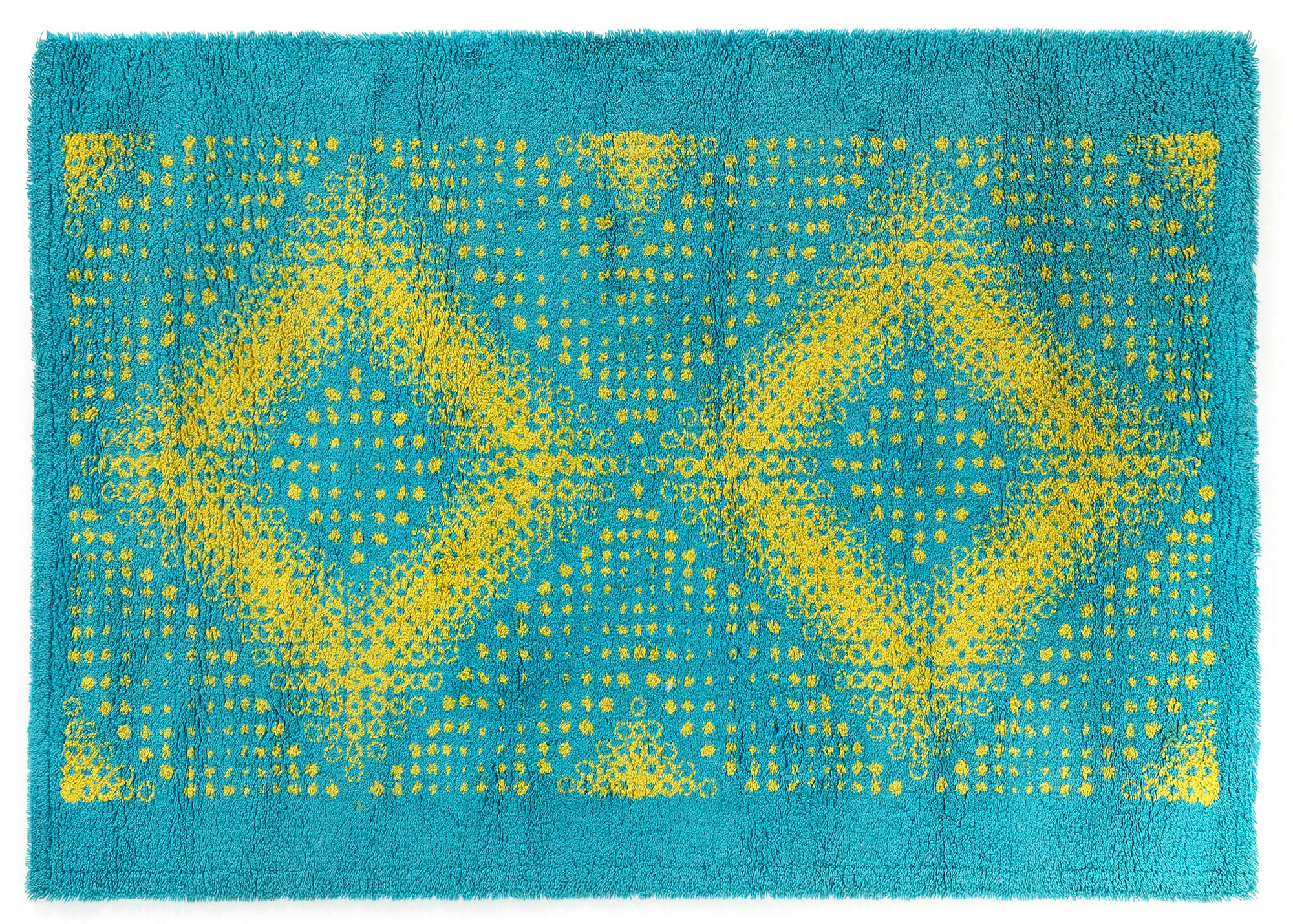Gaetano Pesce, Tappeto in lana intrecciata mod. Moresco., Etichetta di produzione., Prod. Expansion, Italia, 1970 ca., W. 167 - D. 240 - H. 2 Cm