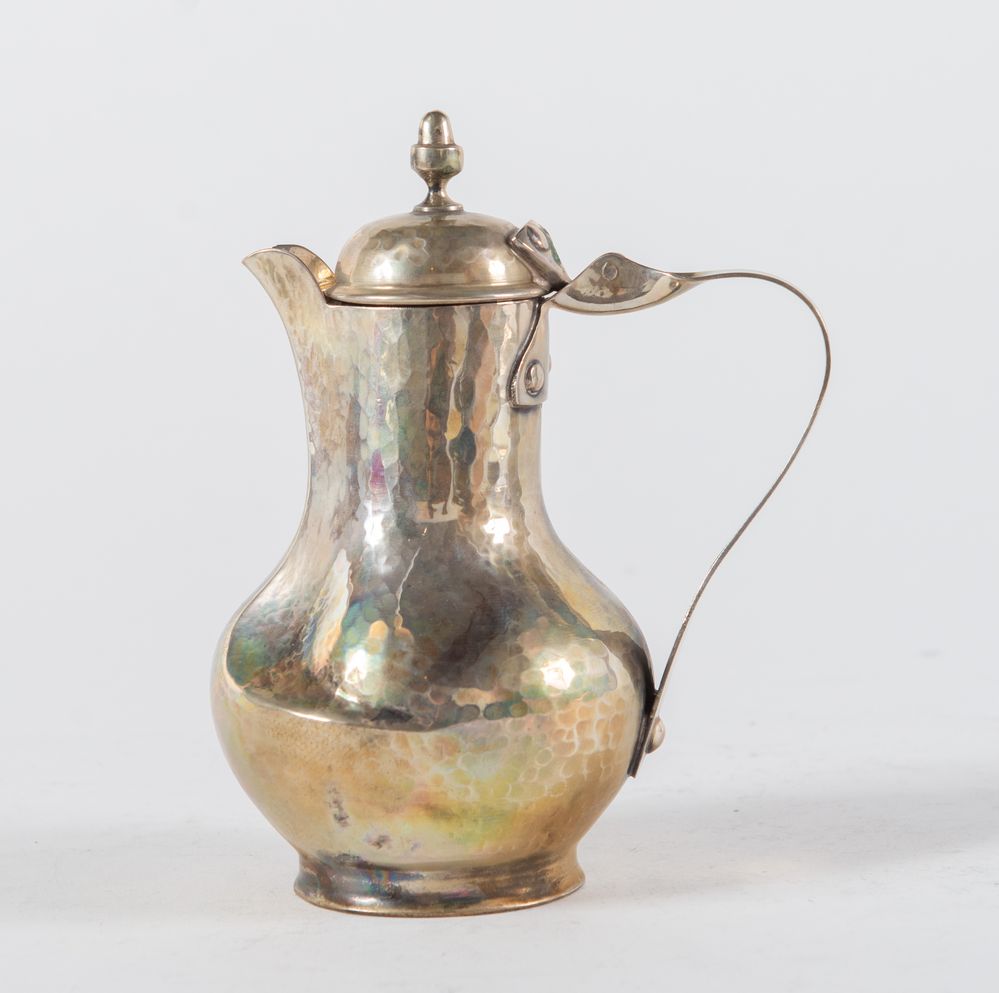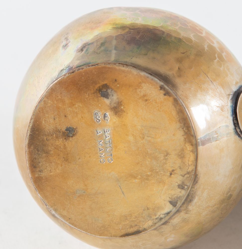 PADOVA, XX secolo. Cioccolatiera in argento 800. Sotto la base reca punzoni: battuto a mano, 800 e losanga locativa padovana. Cm: 16,5x13x10. Peso: 257 gr.
