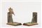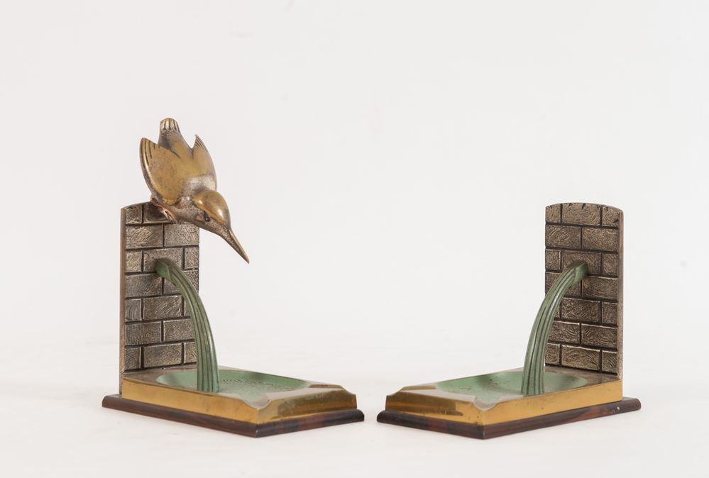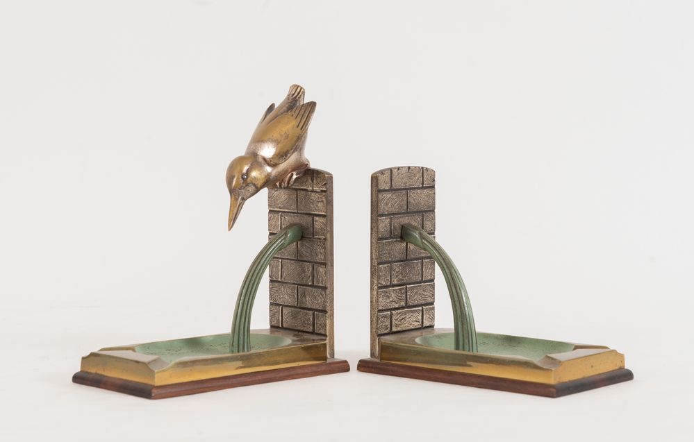 COPPIA DI FERMALIBRI in bronzo parzialmente laccato, raffigurante fontane, su una delle quali poggia un uccellino. Prima metà del XX secolo. Rispettivamente di cm 16,2x7,5x13,5; cm 11x7,5x13,5.