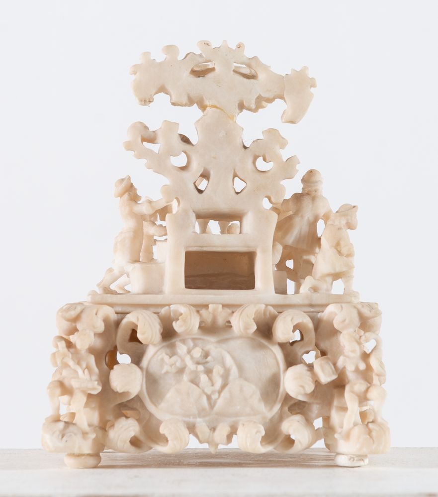 GRUPPO SCULTOREO in alabastro raffigurante scena di genere. Francia, XIX secolo. Cm 21x16,5x12,8.
