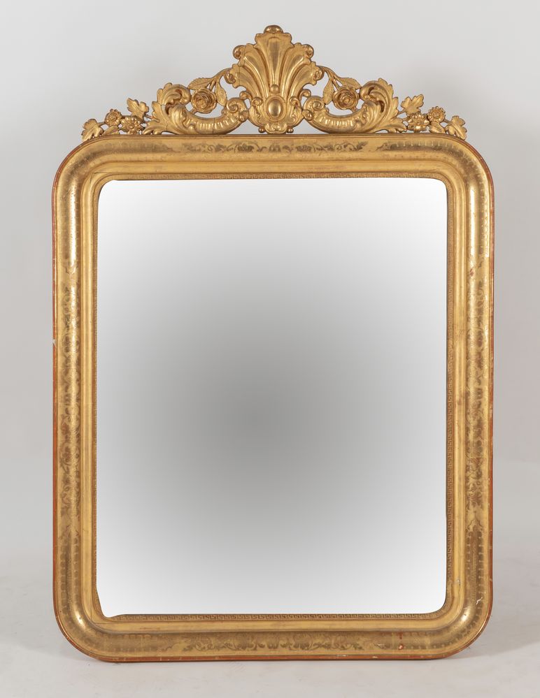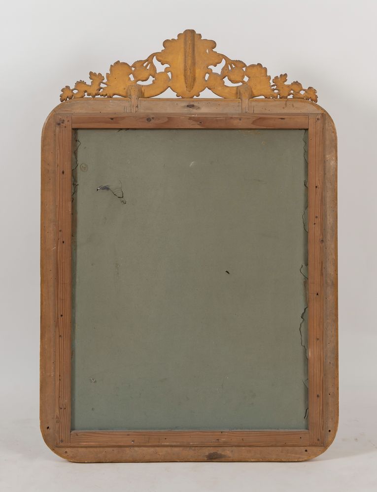 SPECCHIERA in legno intagliato e dorato con cimasa in pastiglia dorata. Specchio originale. Italia, metà del XIX secolo. Cm 130x90.