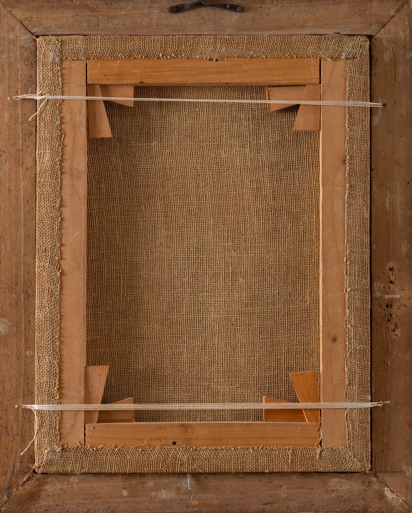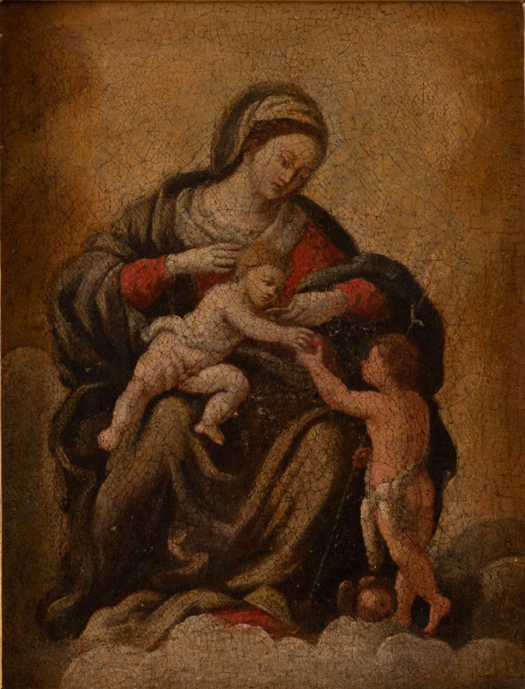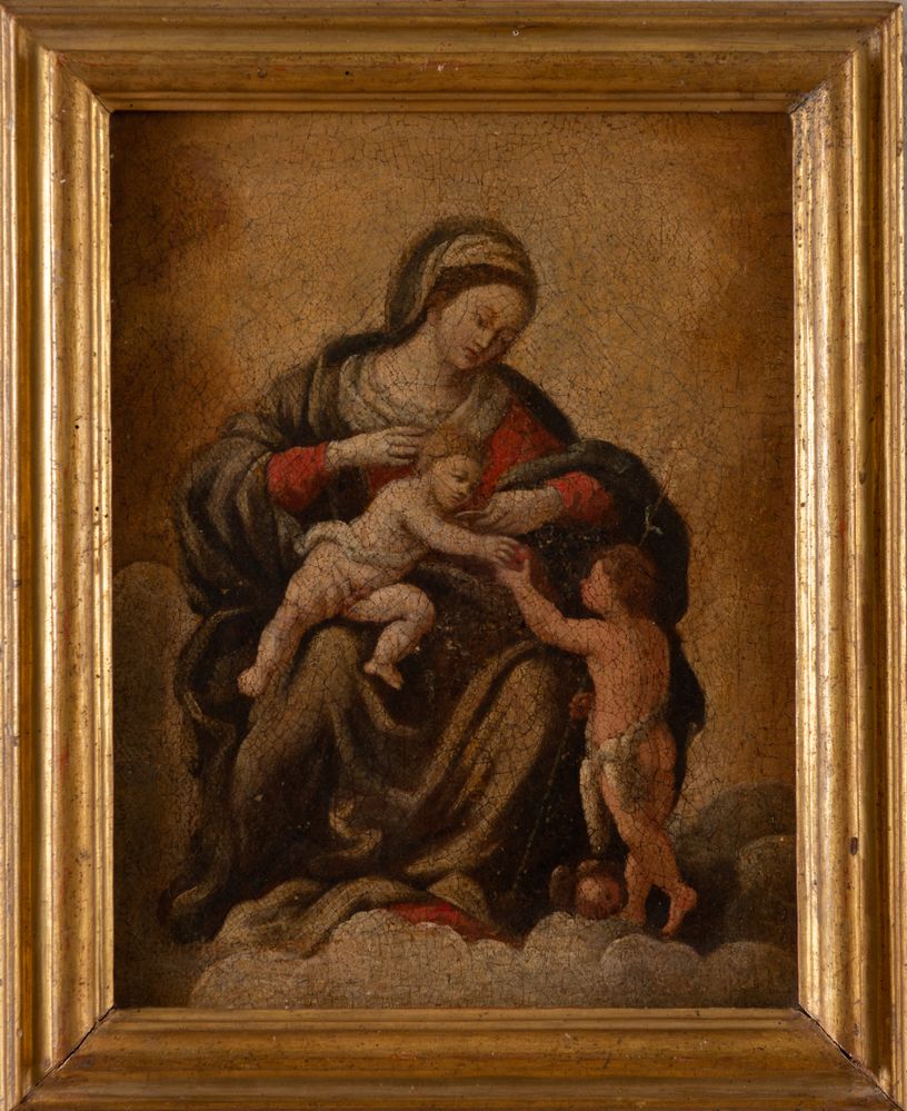 Maestro del XVII secolo "Madonna con bambino e san Giovannino". Olio su tela. Cm 41x31,5. (Restauri).