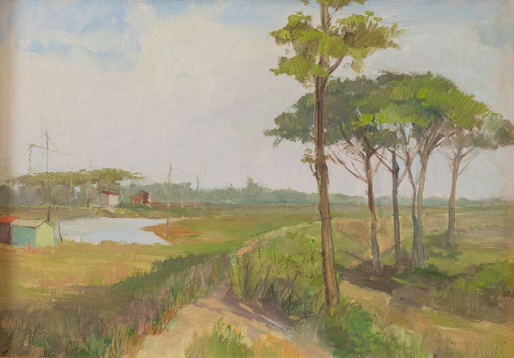 Pittore anonimo del XX secolo "Paesaggio". Disegno su carta. Cm 24x37.