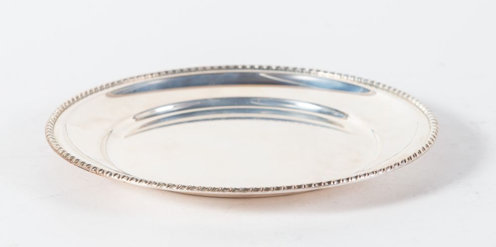 ITALIA, XX secolo. Piatto in argento 800, sotto la base reca punzoni parzialmente visibili: 800, stemma dell'argentiere e losanga locativa. Ø: Cm 25. Peso: 348 gr.