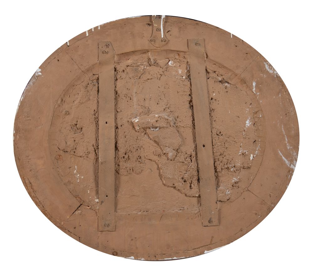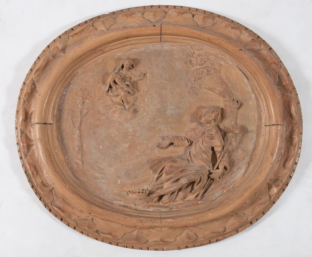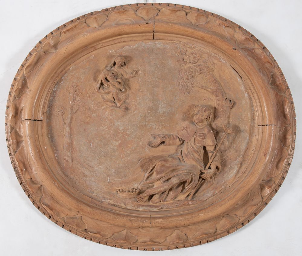 Maestro bolognese del XVIII secolo "Apparizione della Vergine con Bambino a San Giacomo". Altorilievo in terracotta di forma ovale. Cm 62x73x6. (difetti e mancanze)