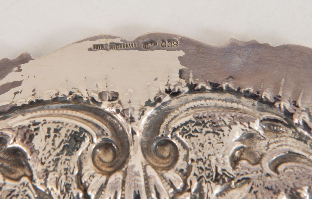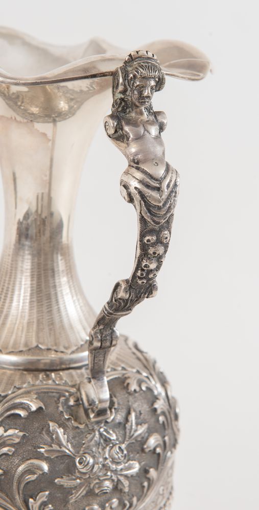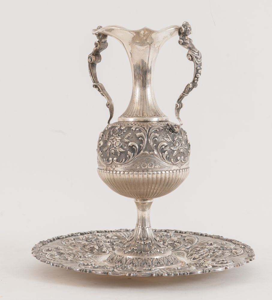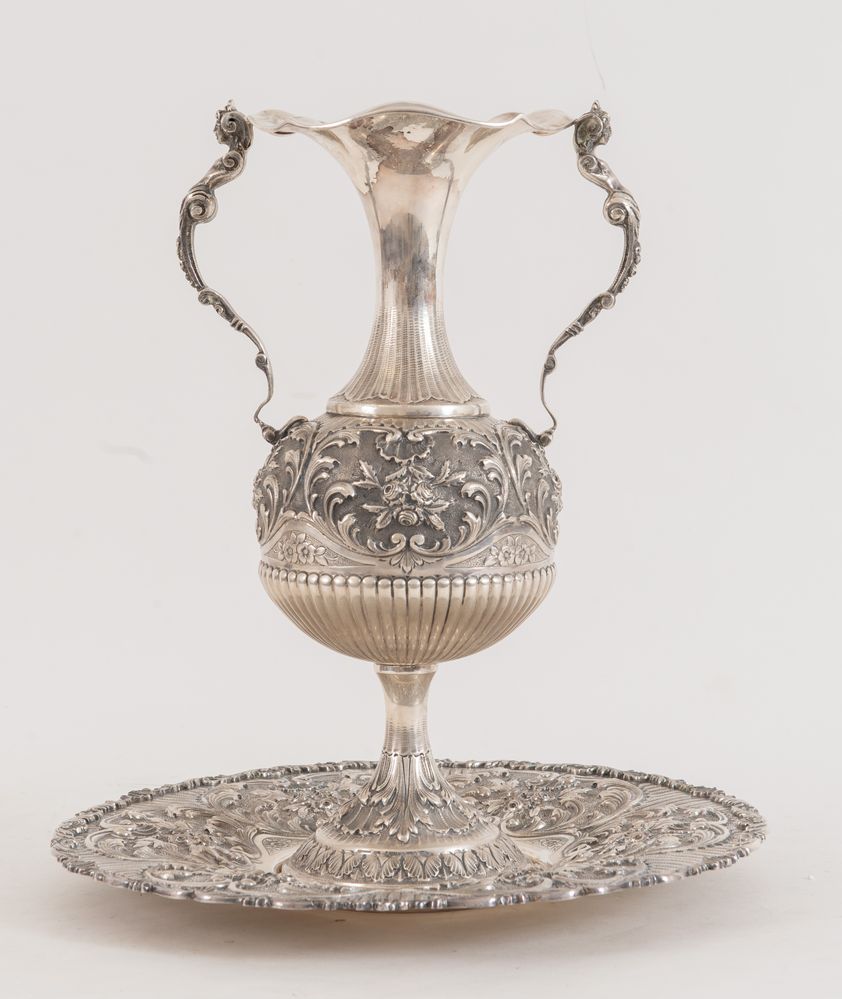 BOTTEGA EUGENIO E ANGELO OREFICE, Milano, XX secolo. Piatto con anfora in argento 800, realizzato in argento cesellato a mano con elementi ornamentali. Le prese laterali dell'anfora sono composte da due figure femminili con gambe mutate con fiori in argento. Recano punzoni: 509MI e 800. Anfora: H. cm 38; piatto: Ø cm 35. Peso complessivo: 2090 gr.