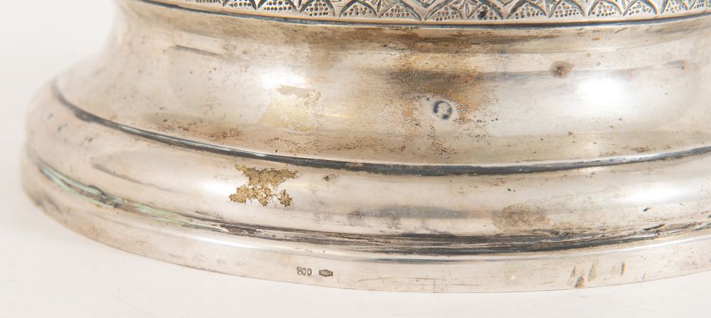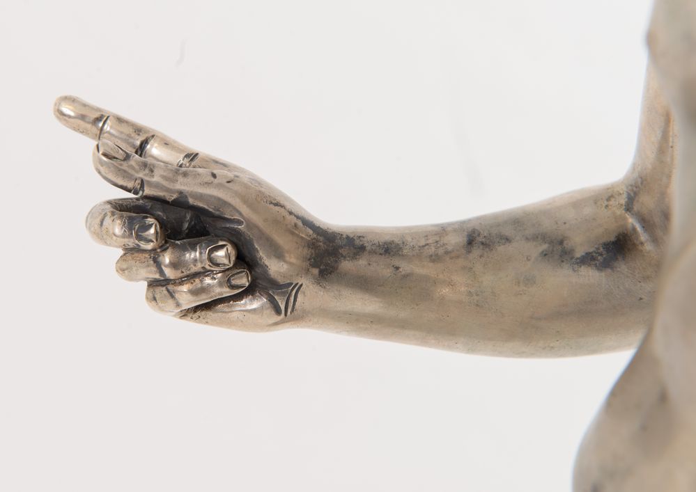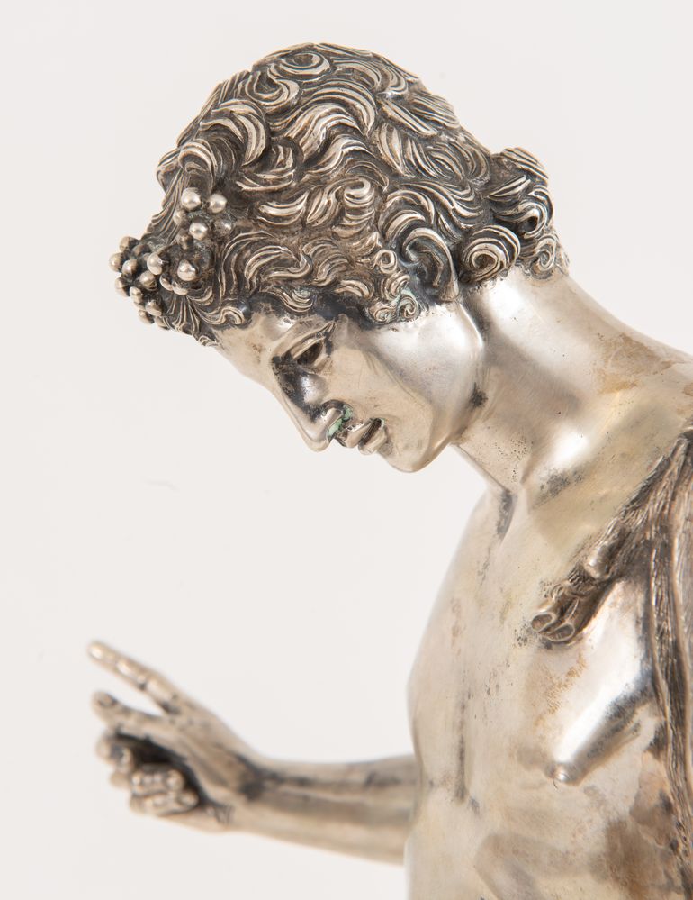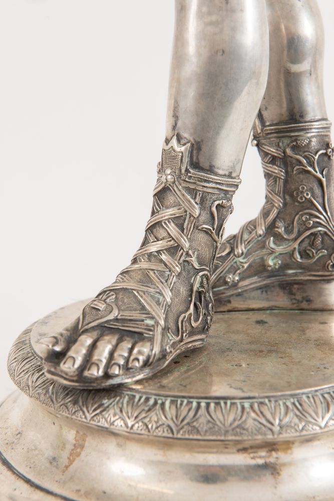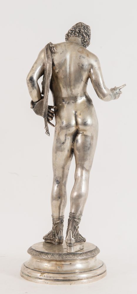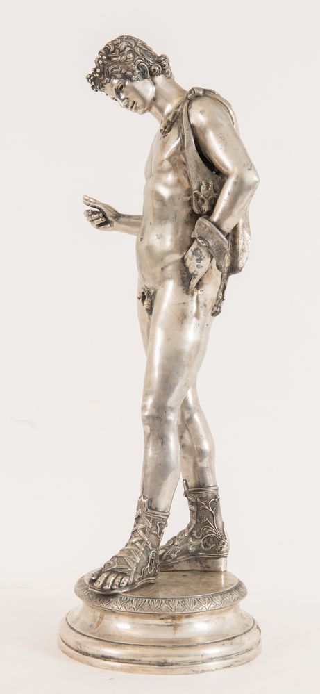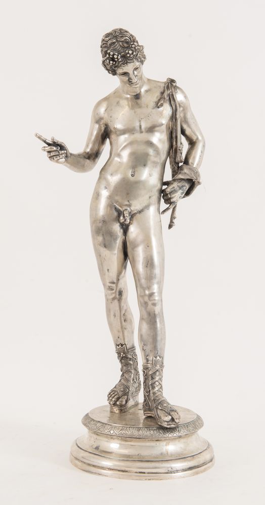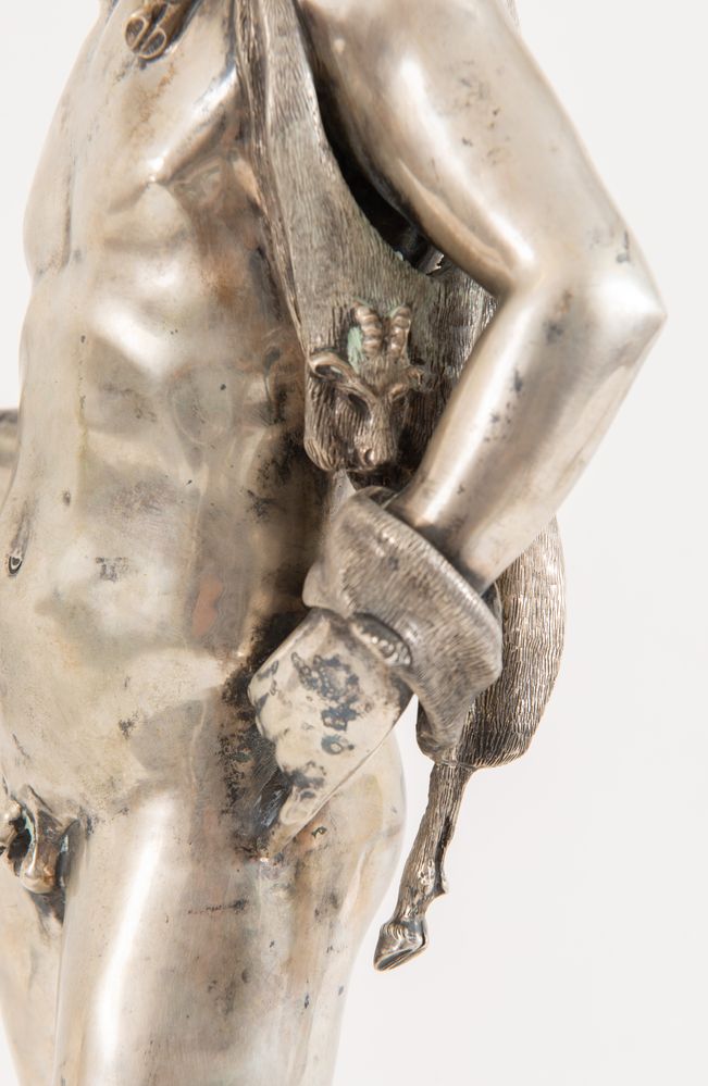 FONDERIA DELMAR - GEMITO, Napoli, fine XIX secolo - inizio XX secolo. Scultura mitologica in argento 800. Al retro reca punzoni: 800 e losanga locativa 221NA. Fonderia fondata da Vincenzo Gemito e Vincenzo De Luca nel 1887, attualmente amministrata da Attilio de Luca. Dalla Gazzetta Ufficiale della Repubblica, 18.12.2010, sede generale num. 295 si verifica che il punzone 221NA della Delmar non risulta essere consegnato anche se di appartenenza. H. cm 62. Peso: 8.448 gr.