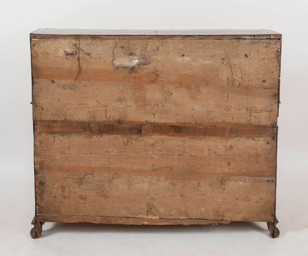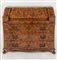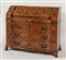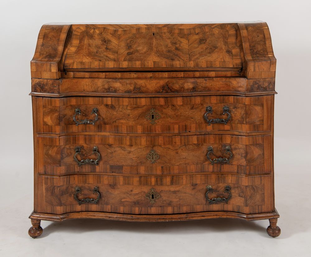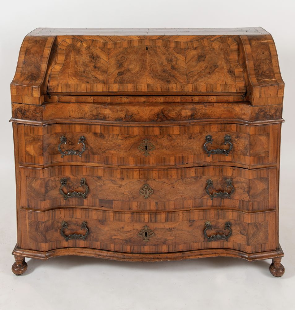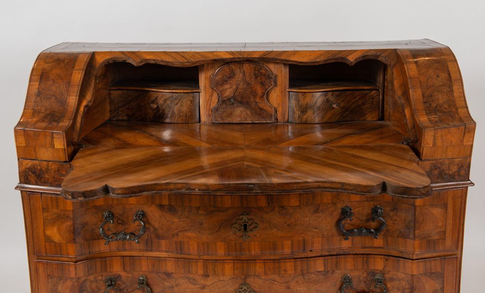 RIBALTA in massello di noce e radica di noce. Presenta il fronte mosso sotteso da cornicione, modanato con sostegni torniti. Reca calatoia sagomata con spallette laterali, celante scarabattolo con quattro cassetti e antina centrale sagomata. Veneto, metà del XVIII secolo. Cm 111x127x55.