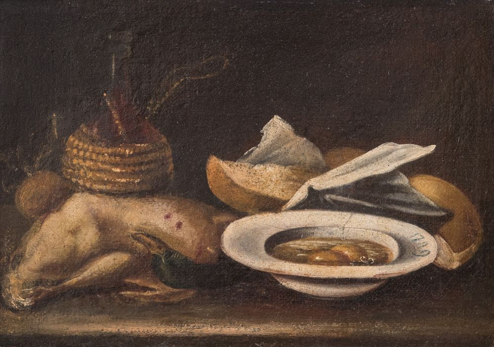 Maestro napoletano del XVIII secolo. Coppia di nature morte. Olio su tela. Cadauno di cm 23x33,5. La natura morta con l'anatra reca sul piatto la data 1789. In origine recano l’attribuzione a Tommaso Realfonso.