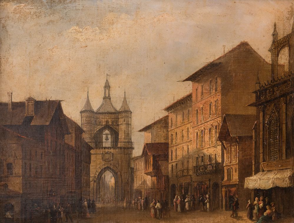Maestro del XIX secolo. Coppia di vedute di città. Olio su tela. Cadauno di...