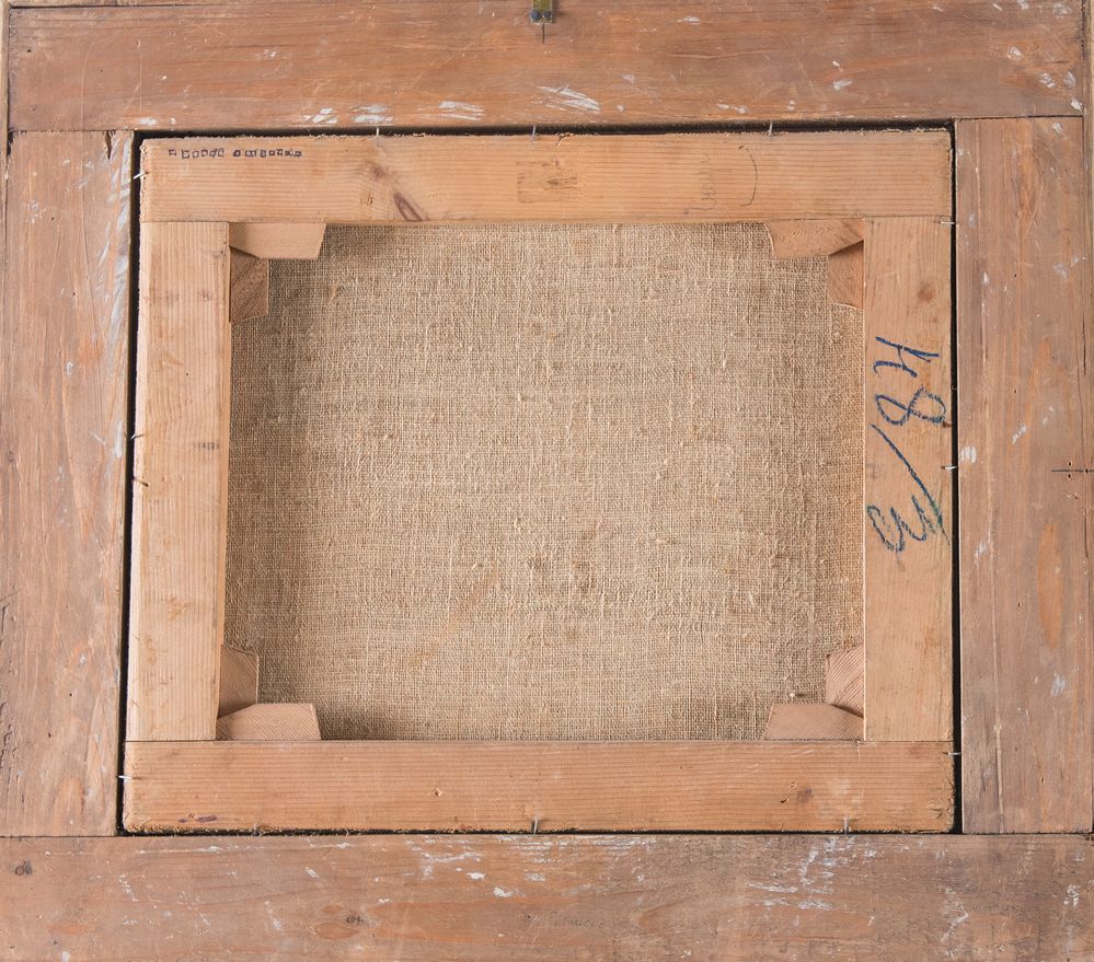 Maestro del XVII secolo “Vescovo con frati domenicani in paesaggio con architettura”. Olio su tela. Bozzetto per una pala d’altare. Cm 34,5x40,5.