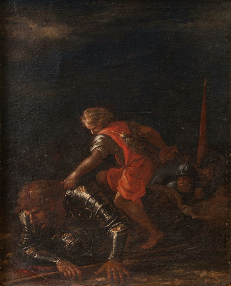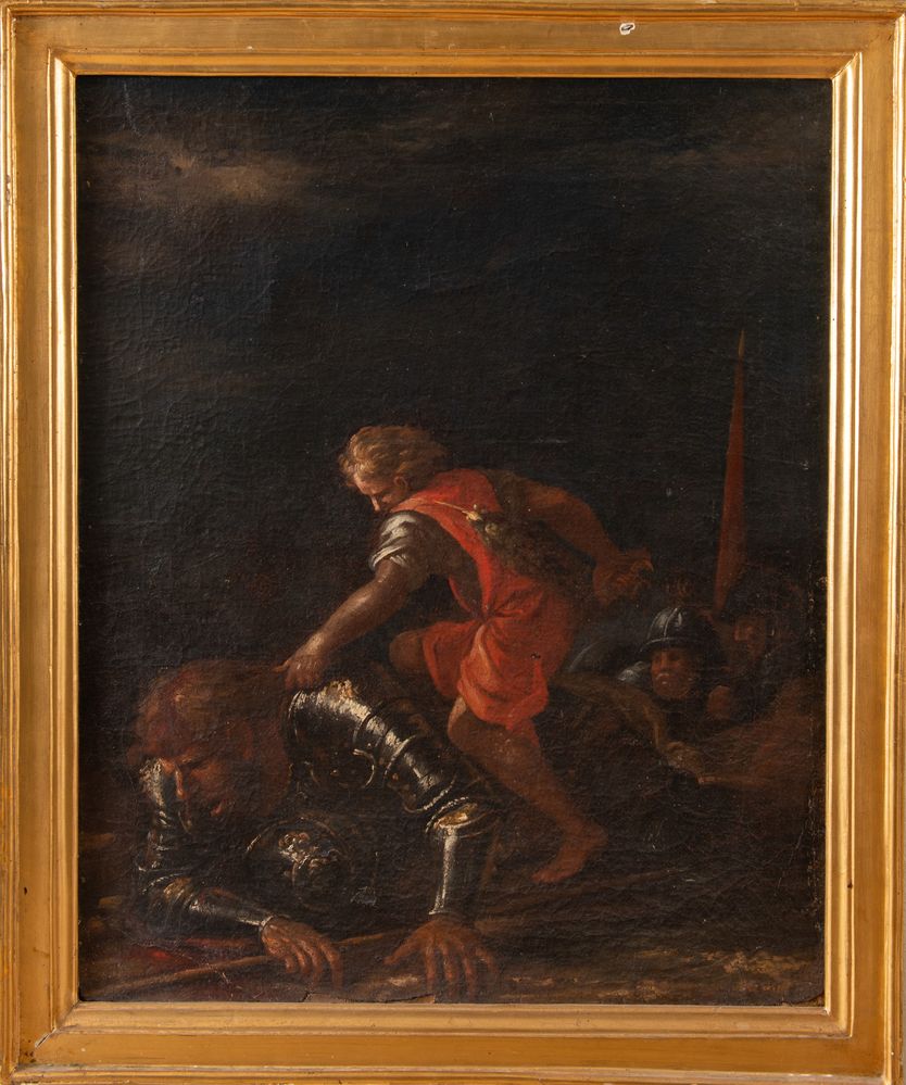 Maestro napoletano del XVII secolo "Davide e Golia". Olio su tela. Cm 80,5x65,5.