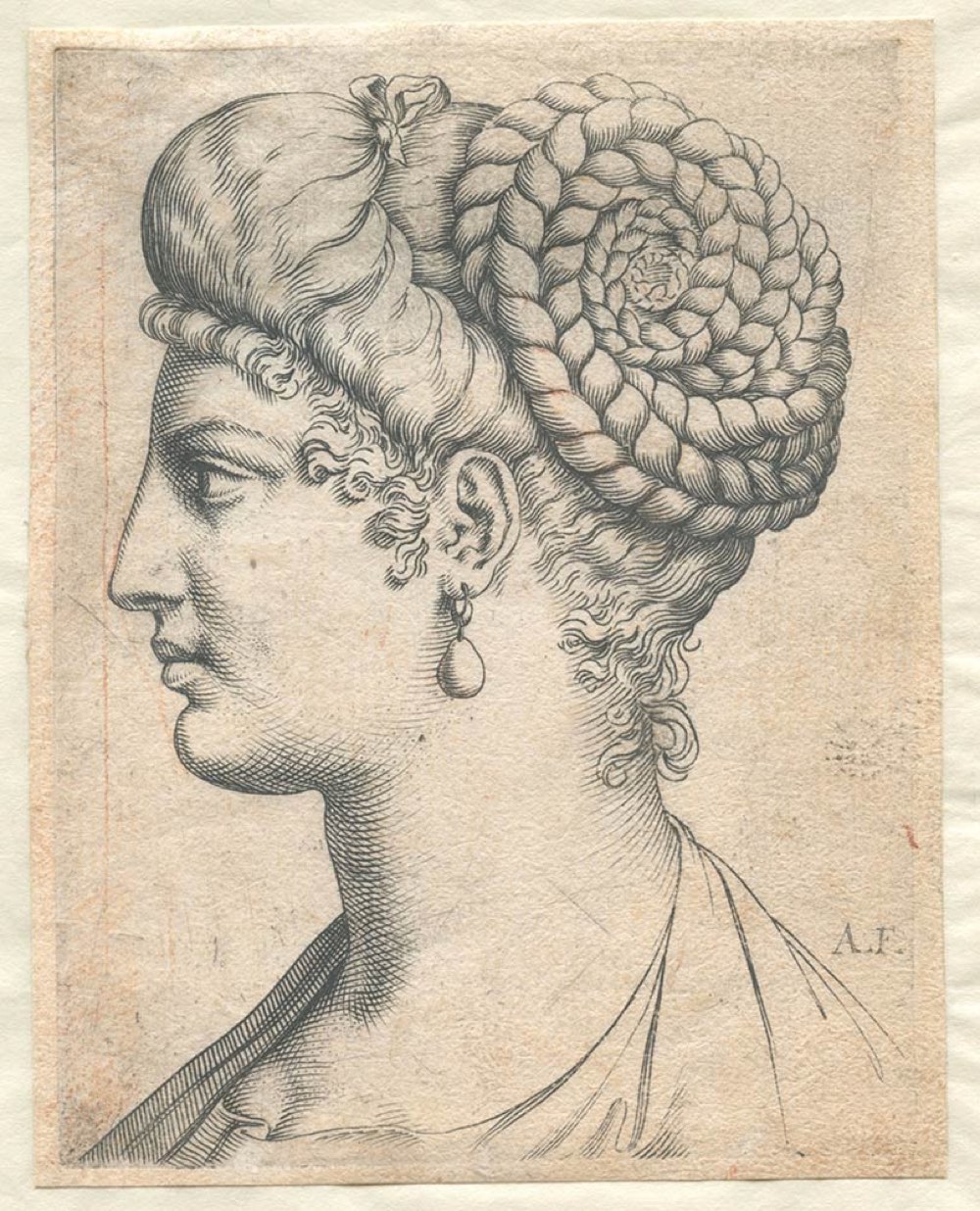 Luca Ciamberlano (1599-1641 (fl.)) e Francesco Brizio (1574-1623) da Agostino Carracci (1557-1602): TESTA DI UNA DONNA CON CAPELLI INTRECCIATI E UN ORECCHINO CON PERLA