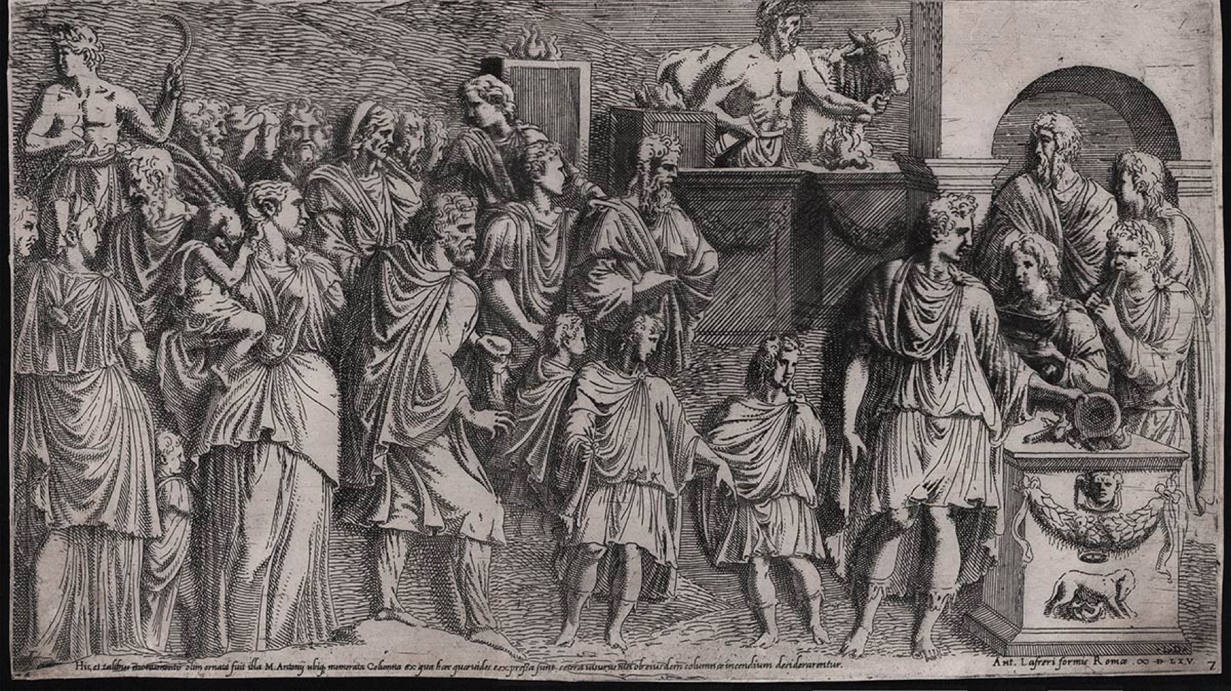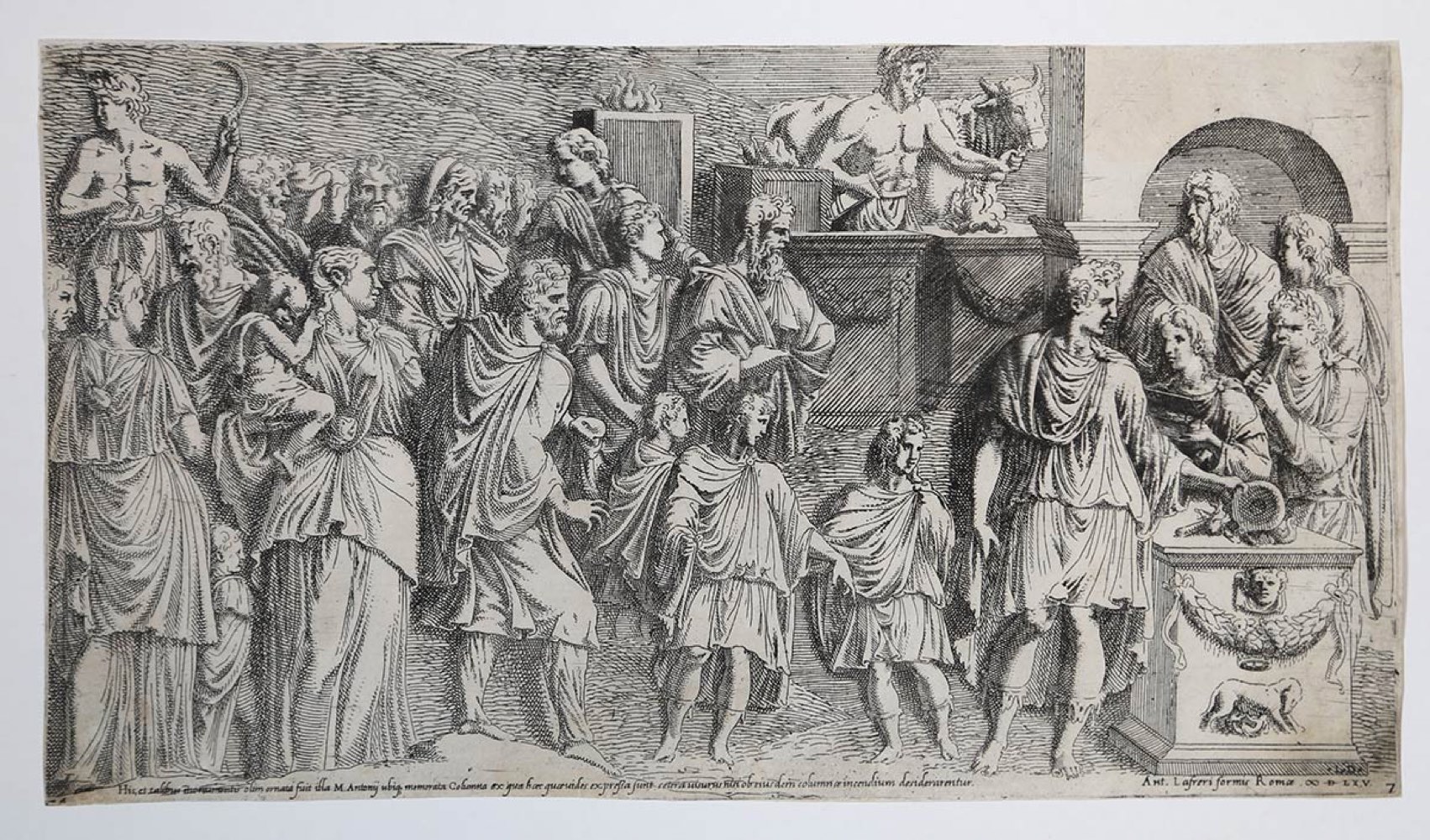 Léon Davent (1540-1556 (fl.)) da Francesco Primaticcio (1504-1570): L’IMPERATORE TRAIANO OFFRE UN SACRIFICIO, 1565