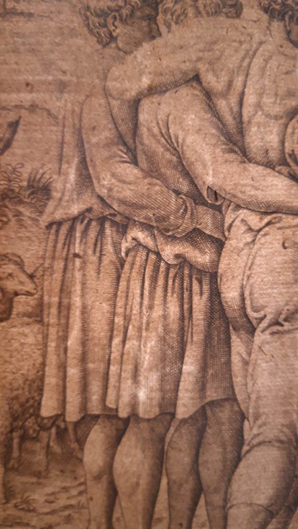 Classificata come stampa anonima della Scuola di Marcantonio Raimondi, l’opera, in controparte rispetto a quella di Beatricetto e con alcune varianti, viene attribuita da Bartsch a Philippe Soye, allievo di Cornelis Cort. A differenza la Massari la considera più vicina allo stile di Giulio Bonasone.