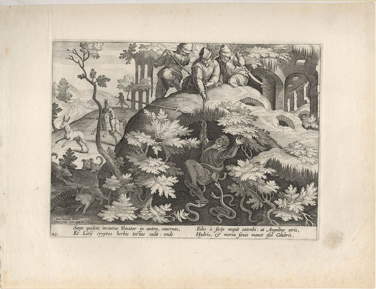 dalla serie 'Venationes Ferarum, Avium, Piscium'. Iscritto: 'Ioan. Stradanus invent.' 'I. Collaert sculp. Ioan Galle exc.'. Testo latino in due colonne: 'Saepe quidem…', numero '42'