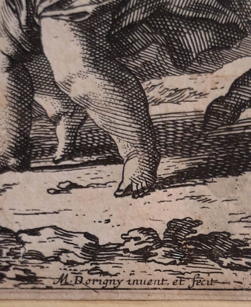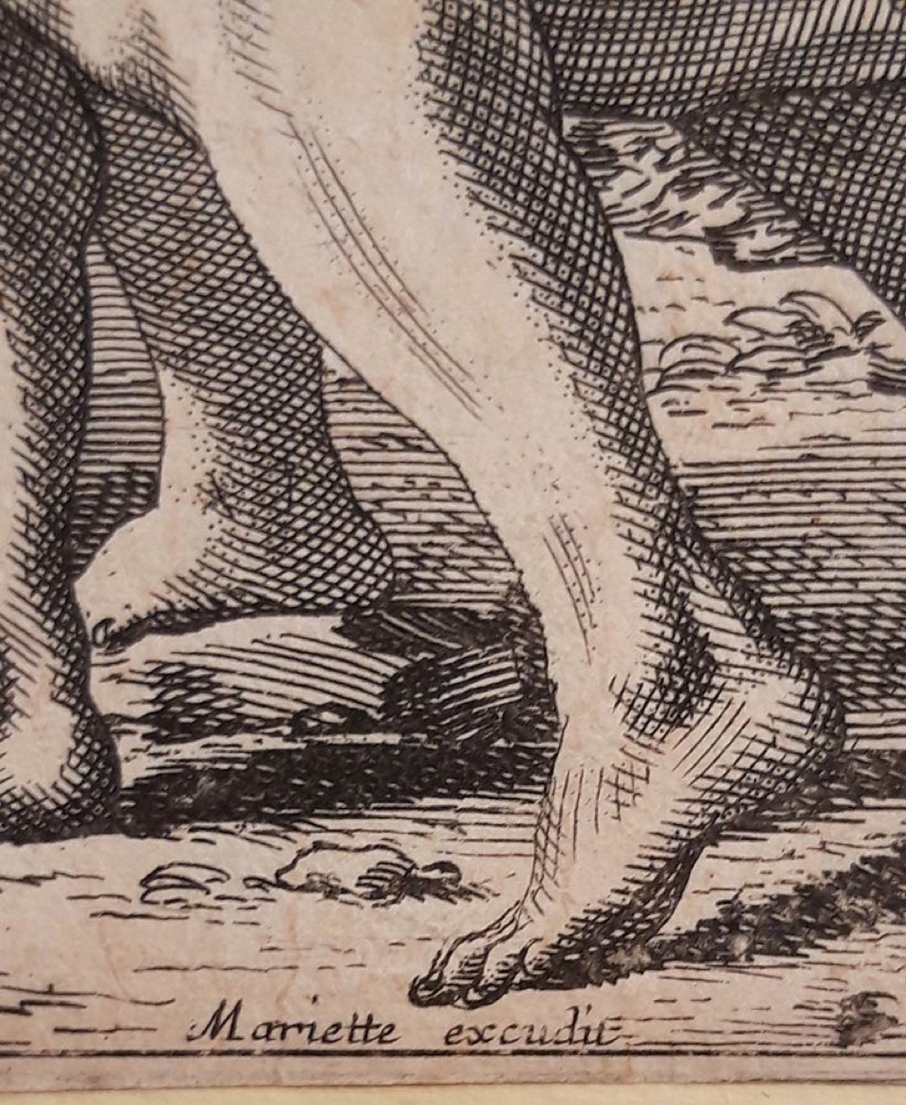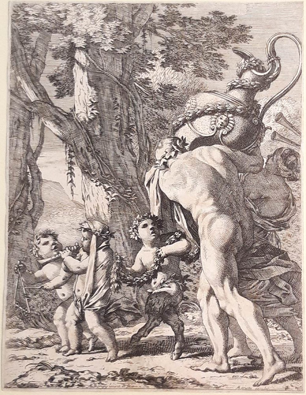 Raro primo stato su due. Nel bordo inferiore, oltre la firma dell’ Artista, l’escudit dello stampatore Pierre Mariette, attivo nella seconda metà del Seicento. Da ‘Baccanali’.