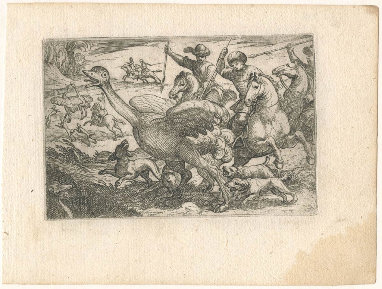 Due bei esemplari con ampi margini, stampati su carta vergata. 'Caccia di cervo' presenta un frammento di filigrana (corona). Cadauno esemplare presenta una leggera macchia nell'angolo inferiore a destra. 'Caccia di cervo' anche un foro irregolare sul margine. Incollati su passepartout moderno in due punti.